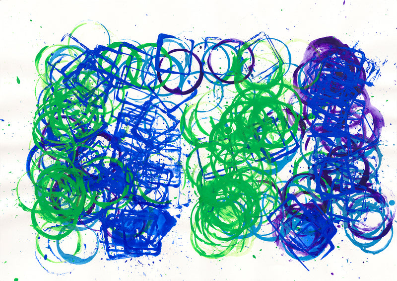 1979年生まれ、滋賀県在住。1998年から『やまなみ工房』に在籍 彼女がやまなみへ通所し、初めて行った作業は牛乳パックを使用した紙漉き作業だった。 その作業工程の中、彼女の役割は取り出した紙の繊維を手のひらで丸め細かな玉を作る作業であった。20年以上たった現在では、その作業はなくなり彼女の活動も変化してきたが、今も彼女の中には仕事というと両手で繊維を丸める行為を表す。そして今、活動の幅が広がり、紙コップを用いて自分の好きな色を決め、判子を一つ一つ丁寧に押していく。紙コップの丸が様々な色で積み重なり、色鮮やかに仕上げていく。 彼女の中で陶土を丸めて玉を作る行為、判子を押す行為は仕事としての位置づけを成し、達成感とやりがいや意欲につながっているのであろう。