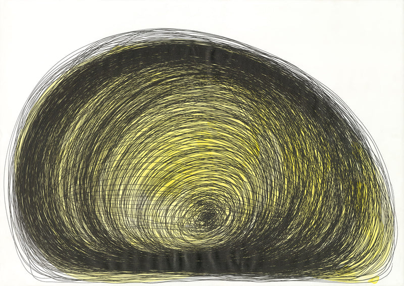 当初は自身の名前「ももこ」を何度も重ねて書いていた。その表現はまるで描く感触を楽しむかのように、名前ではなく円を描き重ねるようになった。にこやかに歌を口ずさみながら絵の具やボールペン、色鉛筆を使用し幾重にも円を重ね完成した色鮮やかな作品は、彼女の朗らかな表情を表しているかのようだ。