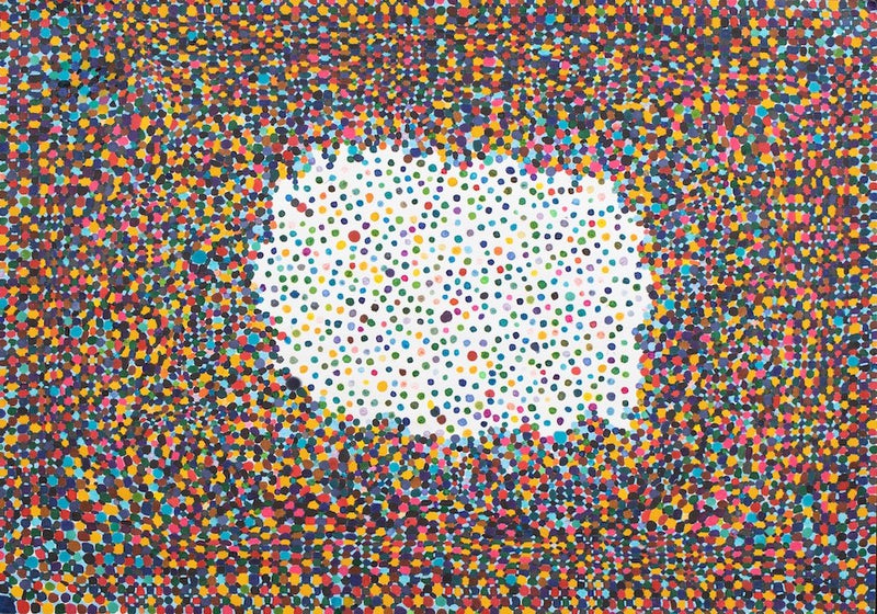 彼の文字への執着は幼少の頃から続いている。自室で密かに制作していた作品が紹介されると、たちまち国内外から注目を集める。画用紙を最後まで埋め尽くした作品は数枚しかなく、大半は途中でとまっていて、なぜか縦方向に描き進んでいる。作品の評価や世間の注目とは無縁に、10年ほど前から漢字ではなく、色とりどりのベルや星、そして近年は小さなドットを描くことに熱中している。まるで染め物のように裏面に滲み出るまで執拗に塗り込み、その行為自体を楽しんでいるかのよう。執念的と言える彼のこだわりと手法に思わず感嘆する。
