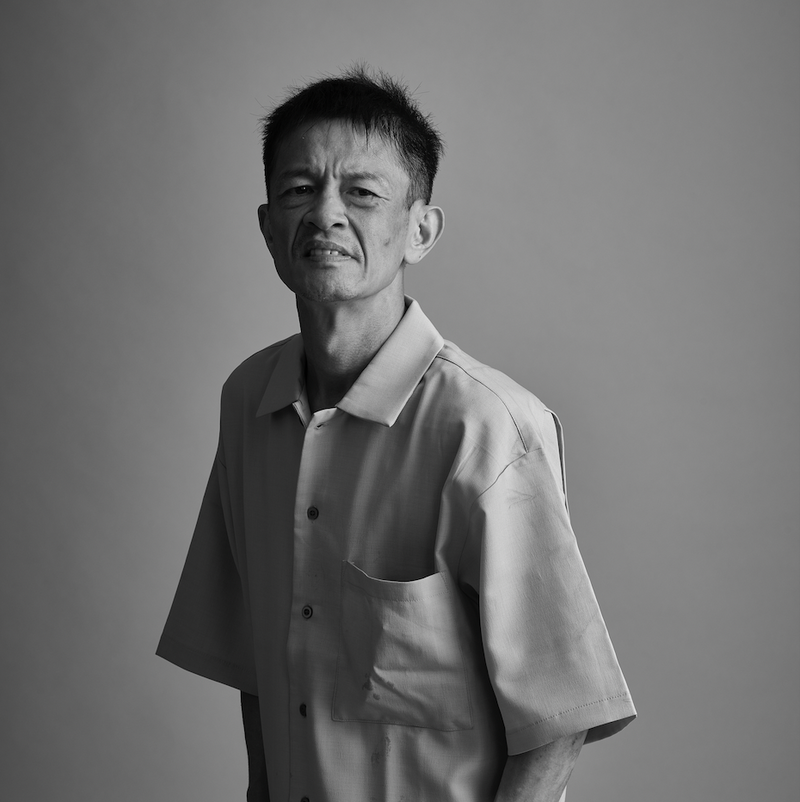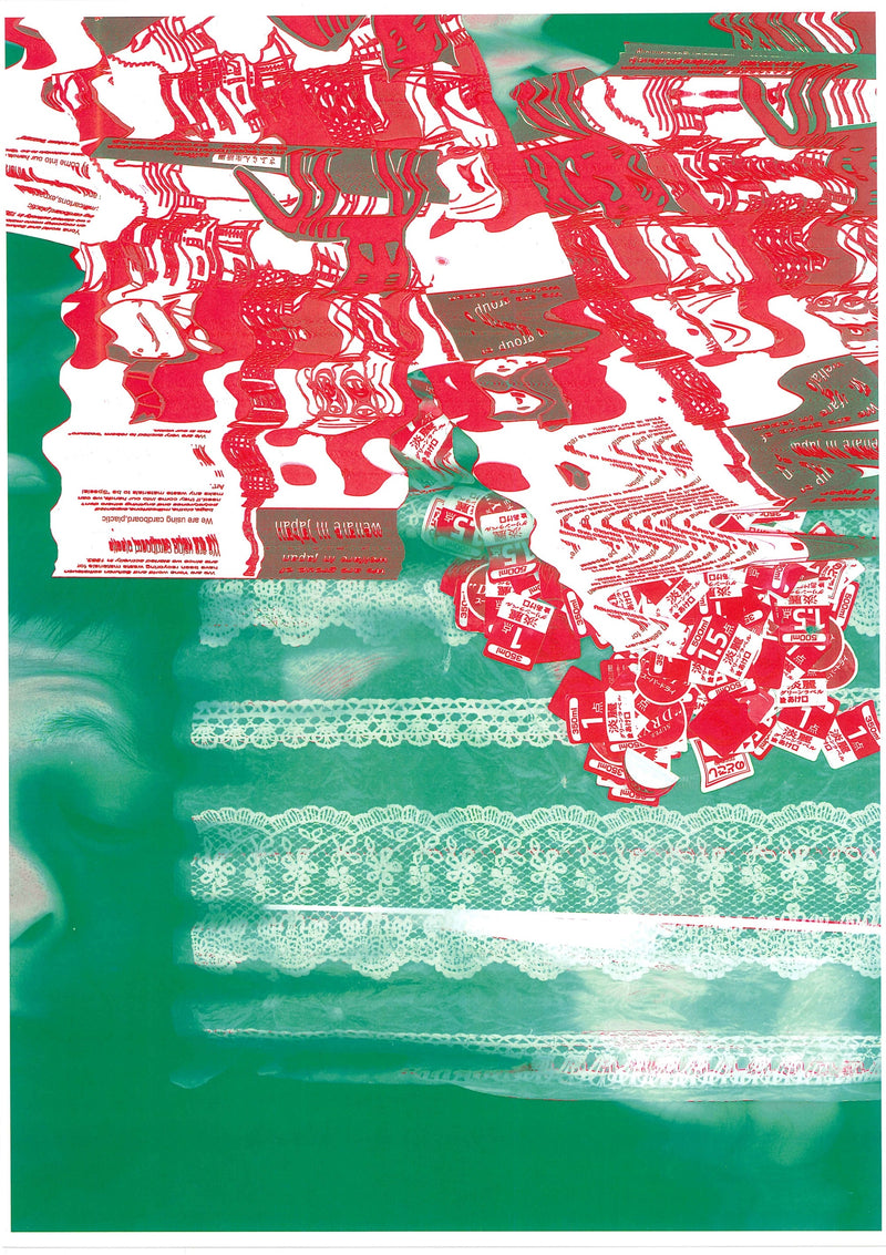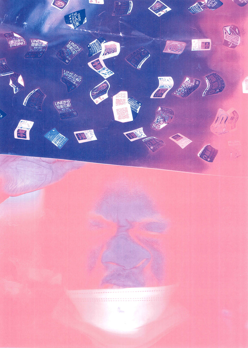 ガラス面に顔を押し付け自分でボタン操作し、センサー光の動きと共に身体を動かすことで、画面に独特の歪みを作り出す。作品中に多用されるシールは、施設でのアルミ缶作業中に剥がした景品応募シールで、これまで何度も当選している。