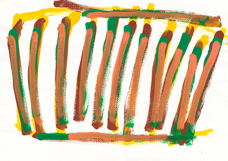 1996年生まれ 滋賀県在住 2015年から『やまなみ工房』に在籍 もともと創作活動に消極的だった彼が、気負いなく作業感覚で取り組める方法のひとつとして、スタンプ押しの活動が始まった。巻いて棒状にしたダンボール紙や紙コップ、ゴム判子等、様々な素材の判子を用いて自分の好きな色を決めて、判子を一つ一つ確実に丁寧に押してゆく。取り組む中で徐々に創作に対する苦手意識から解放され、作品が完成するたびにやりがいや喜び、そして彼の中で創作に対する自信が深まった。 今では内向的な彼が自己表現の一つとして取り組める活動となる。