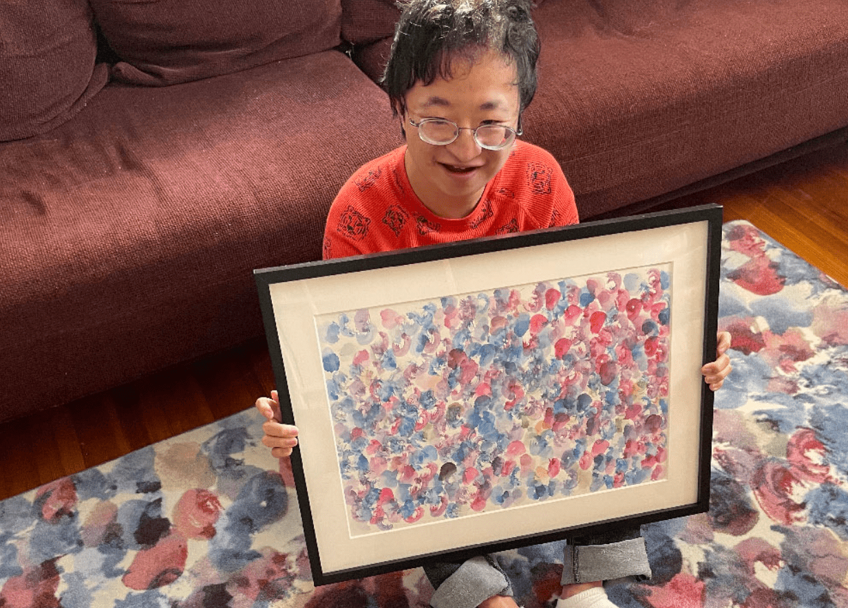 10歳のサマーキャンプで水彩画と出会って以来、自宅で「1日1枚」絵を描くのが彼の日課 。具体的なモデルはなく、その日の心の中にあるイメージに応じてパレットから数色の組み合わせを選び、ジェリービーンズや雨粒を彷彿とさせる水々しいタッチで大判画用紙を埋め尽くしていく。 色相が濁らないよう、米国製の透明水彩絵の具を愛用している。完成した絵を見た人が「きれいねー」と伝えると、嬉しそうに「きれいねー」とオウム返しする。余暇にはボストンのアートクラスで、さをり織り、ピアノ、ダンスを楽しんでいる。