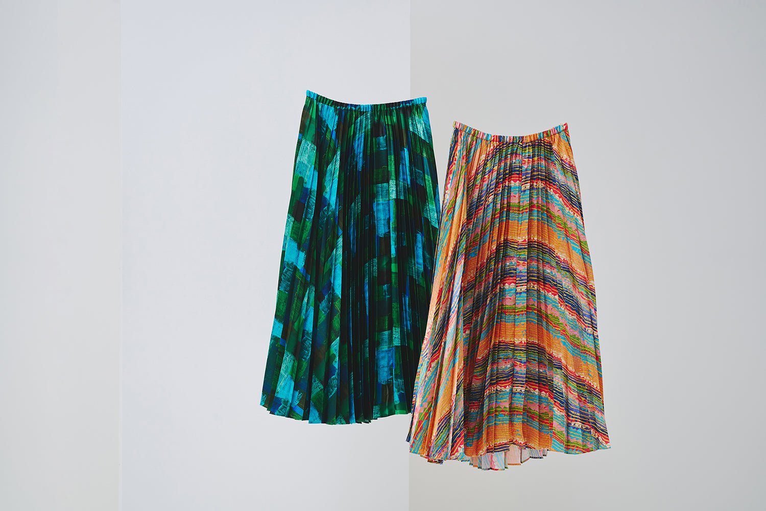 アートが体の動きとともに立ち上がる。歩くたびに、風になびくたびに、プリーツが揺れ、スカートの表情が変わります。向きを変えるごとに現れる色や形は装いに彩りを与えてくれます。