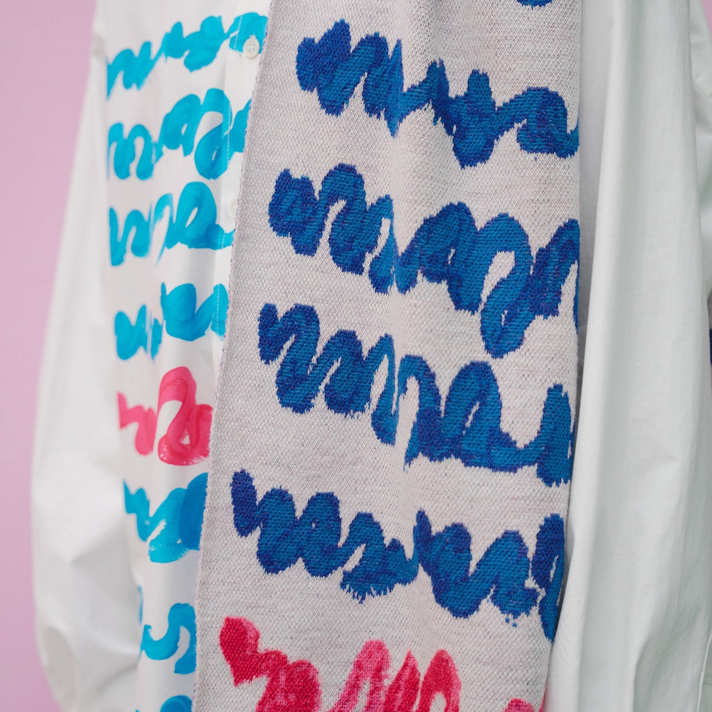 アートの唯一無二の色彩や筆使いを再現すべく、ジャガード織りの技法で編み上げました。複数の色糸を使用し、生地そのものでアートを再現することで、プリントでは再現しきれない、作品独自の色彩と質感を再現しています。