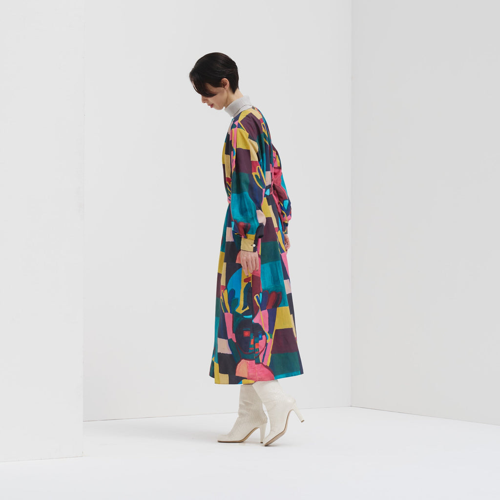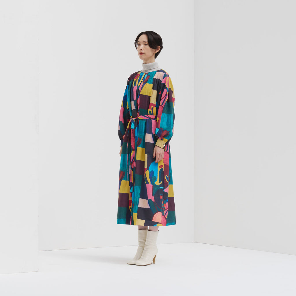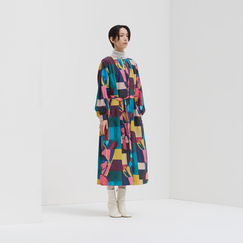 異彩が放つ魅力を感じられながらも、合わせるアイテムを選ばない絶妙なアートをセレクトしました。デイリーシーンをさりげなく華やかに彩るワンピースです。環境に優しいリサイクルポリエステル繊維のスパンブロード生地を使用し、先シーズンより少し光沢を抑えた生地感に仕上げました。パーティなどのおでかけにも、日常のおしゃれ着にも馴染みます。リラックス感がありながら上品な印象が魅力です。