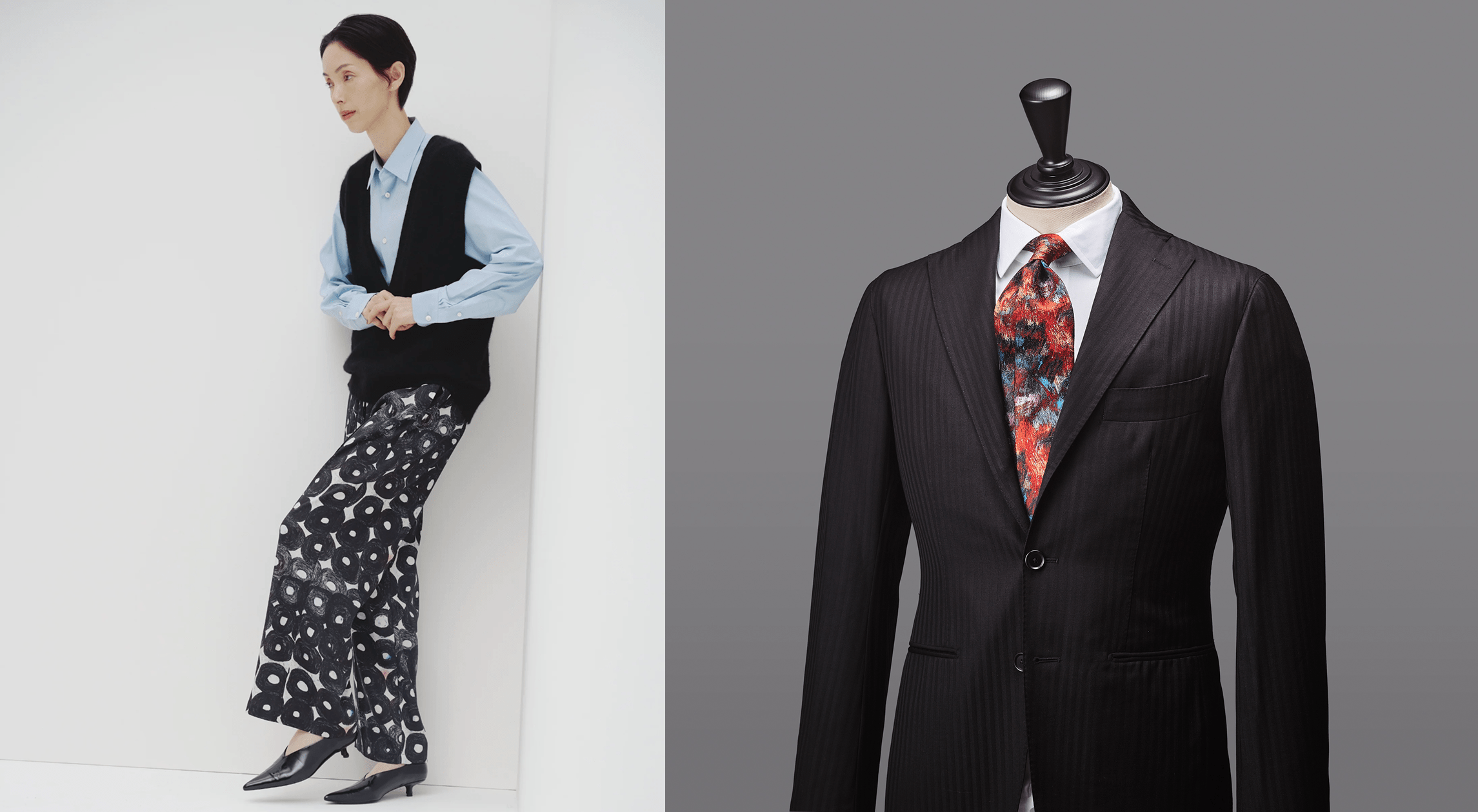 人気のシャツワンピース、フレアスカート、サテンパンツ、ネクタイに新作アートが登場しました。同じアイテムでも、まとうアートによって変わる雰囲気をお楽しみください。