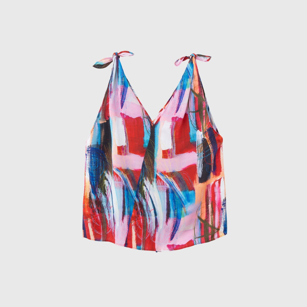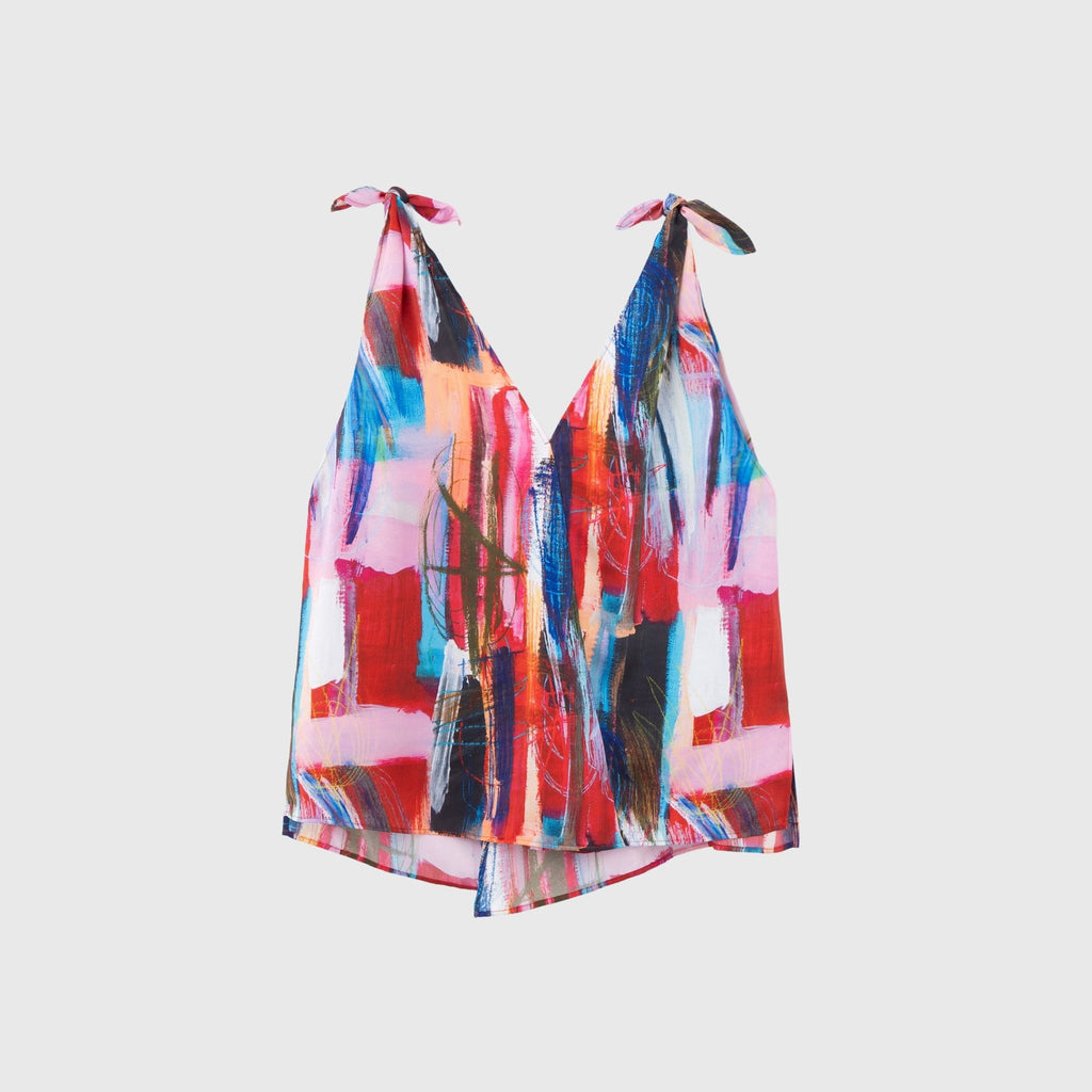 Ce caraco présente un décolleté en V profond et des bretelles pour un look sain. Son ourlet évasé peut être porté tel quel ou noué pour un look plus défini. Il se porte également en automne et en hiver en le superposant à un haut coupé-cousu ou en maille.