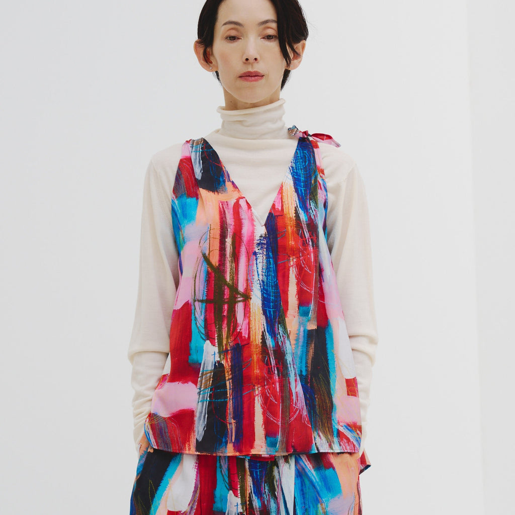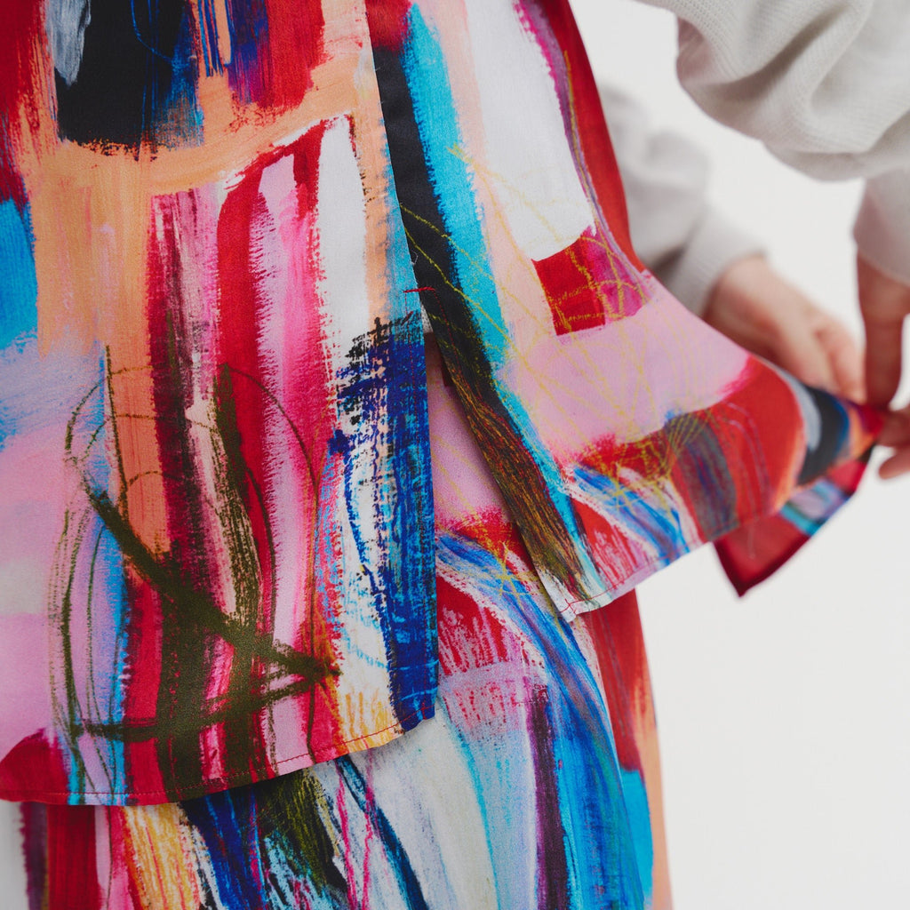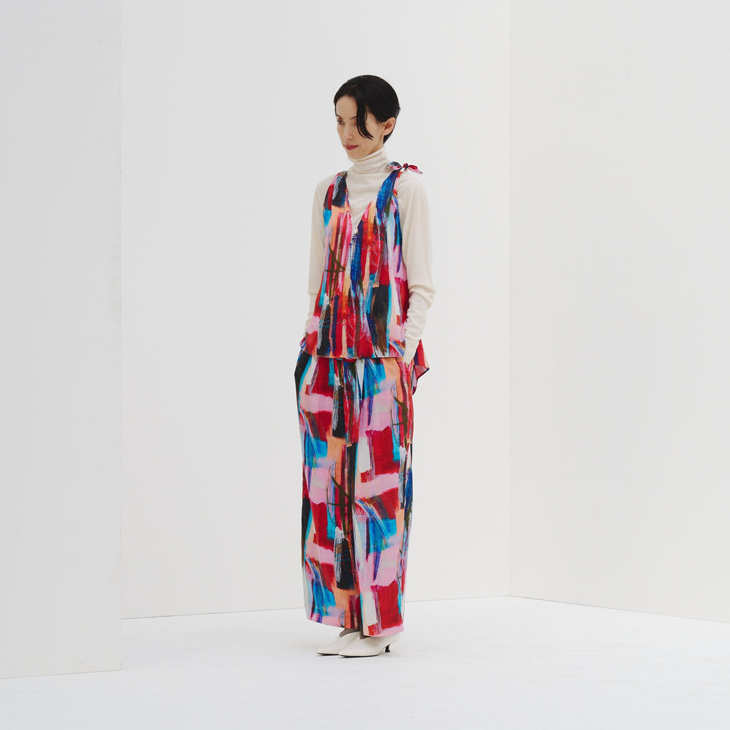 Ce chemisier caraco et son pantalon sont ornés d'une œuvre de l'artiste allemande Birte Seidensticker. Son col en V épuré et sa silhouette douce subliment votre silhouette et vous mettent en valeur. Pour l'automne et l'hiver, nous vous recommandons de le porter avec un haut en maille ou en coupe-cousu. Vous pouvez également l'associer à une jupe ou un pantalon orné de la même œuvre.