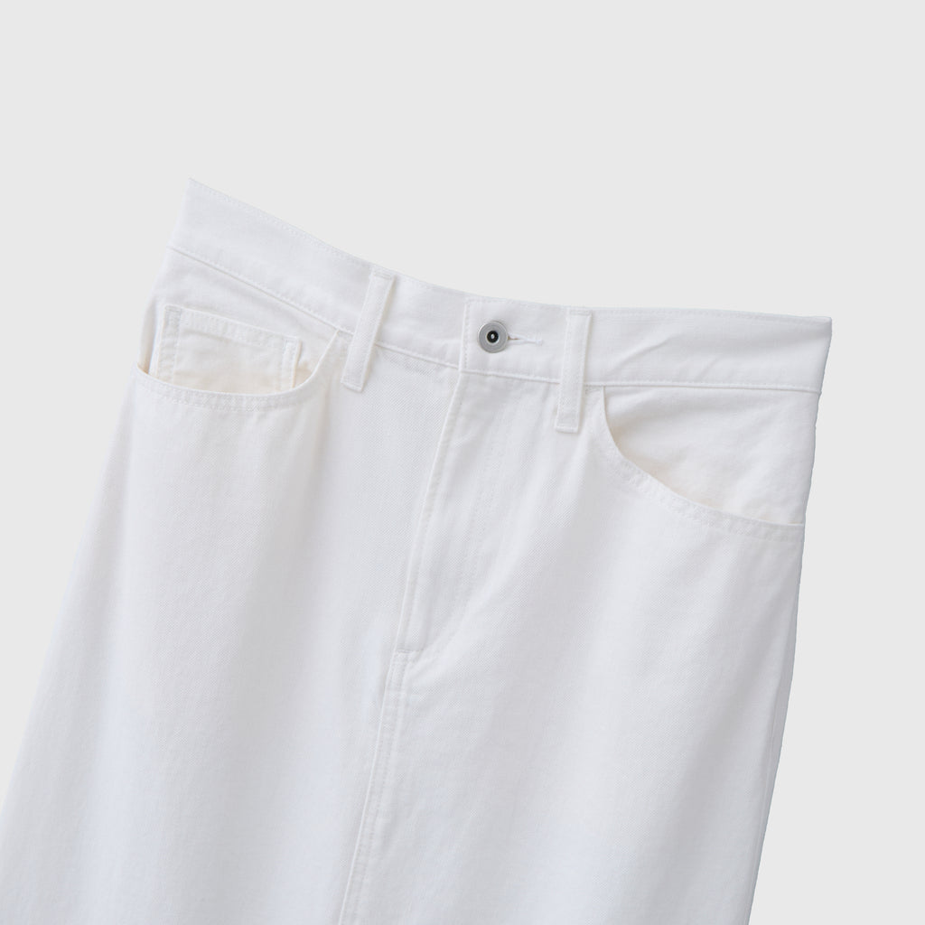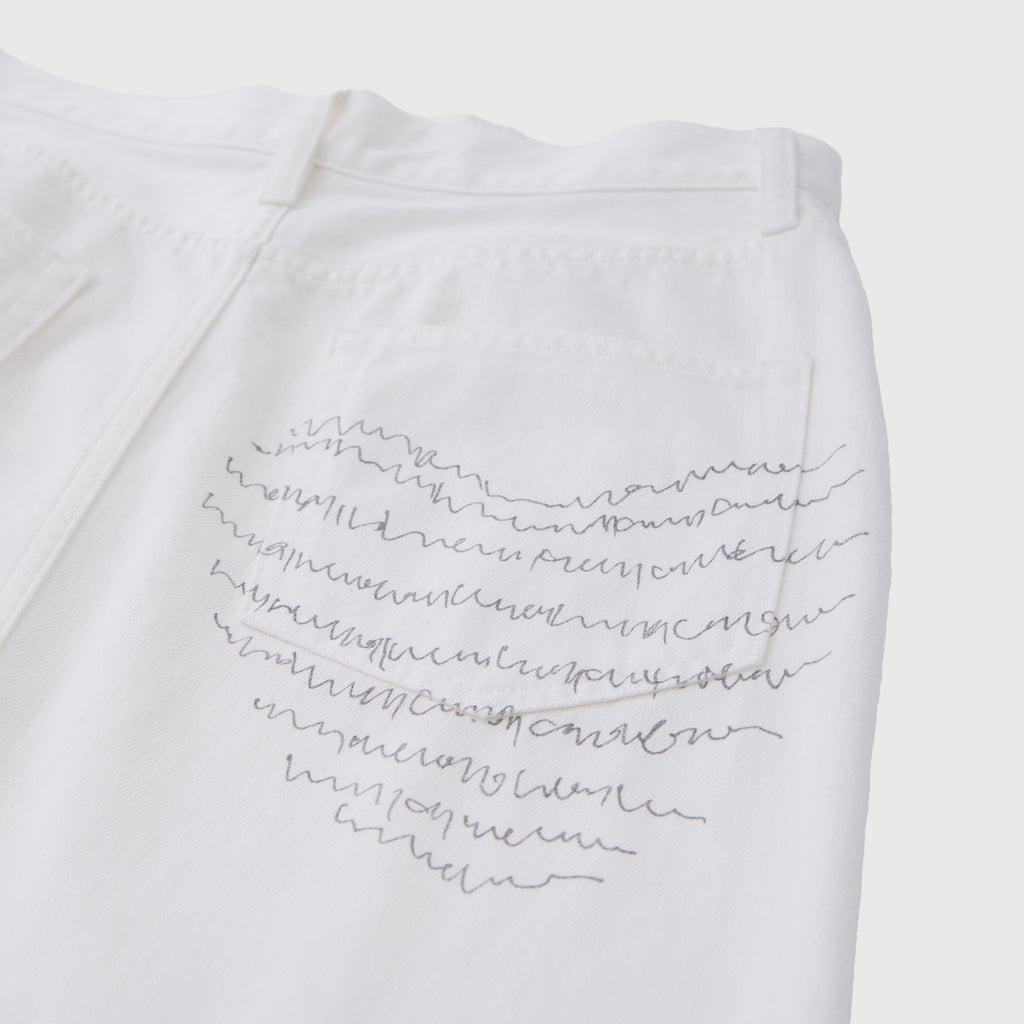 アートがワンポイントで入ったデザインなので、さり気なく異彩をまとうことができるデニムパンツ。モノトーンを基調としたアートで、合わせるトップスを選びません。履き心地のよい柔らかなデニム生地を使用し、バックスリットを深めにいれることで足さばきも良いスカートに仕上げました。