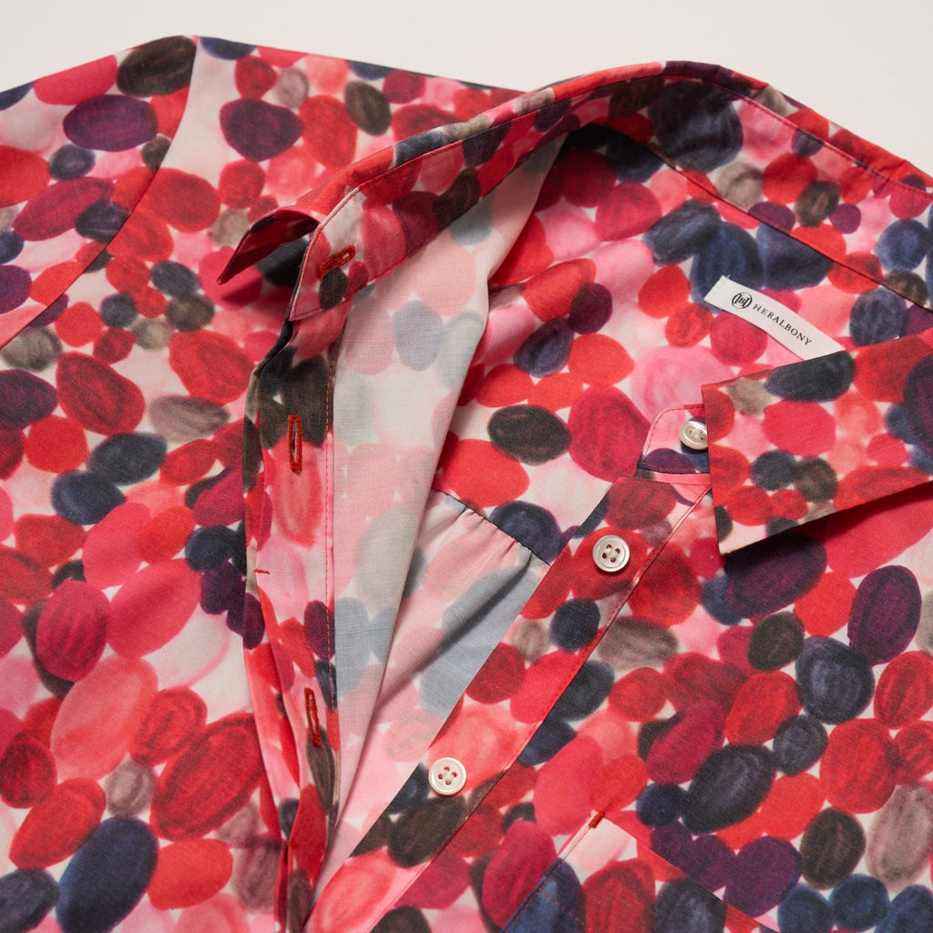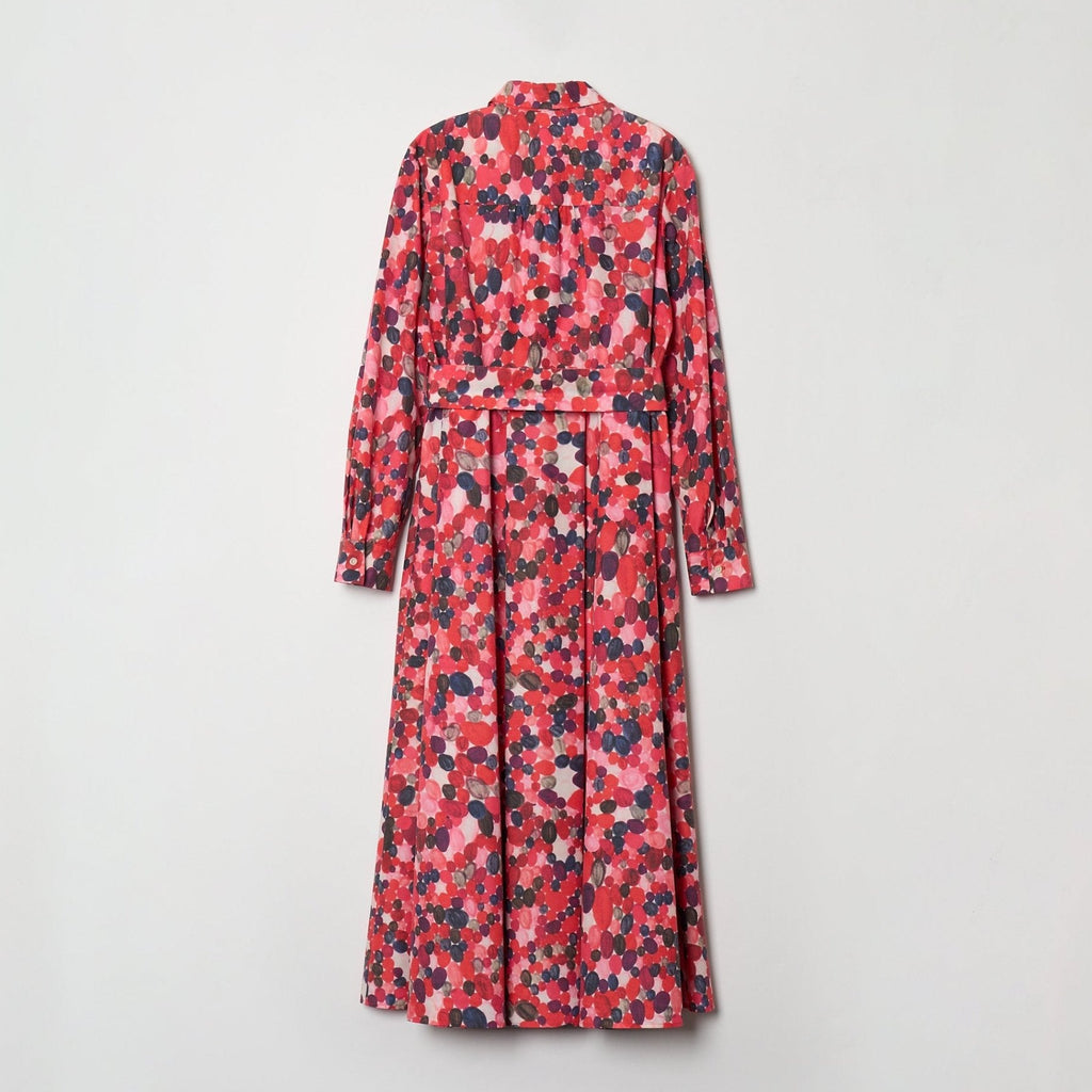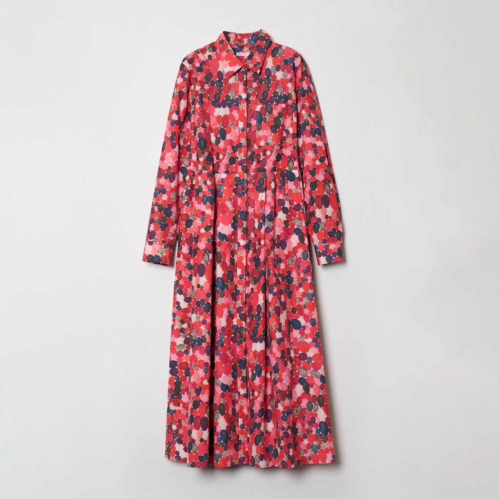 主役級の存在感を放つフレアースカートワンピース。上半身のシャツディテールが持つ構築的な美しさと、下半身のたっぷりと生地が広がるシルエットが絶妙なバランスを生み出します。