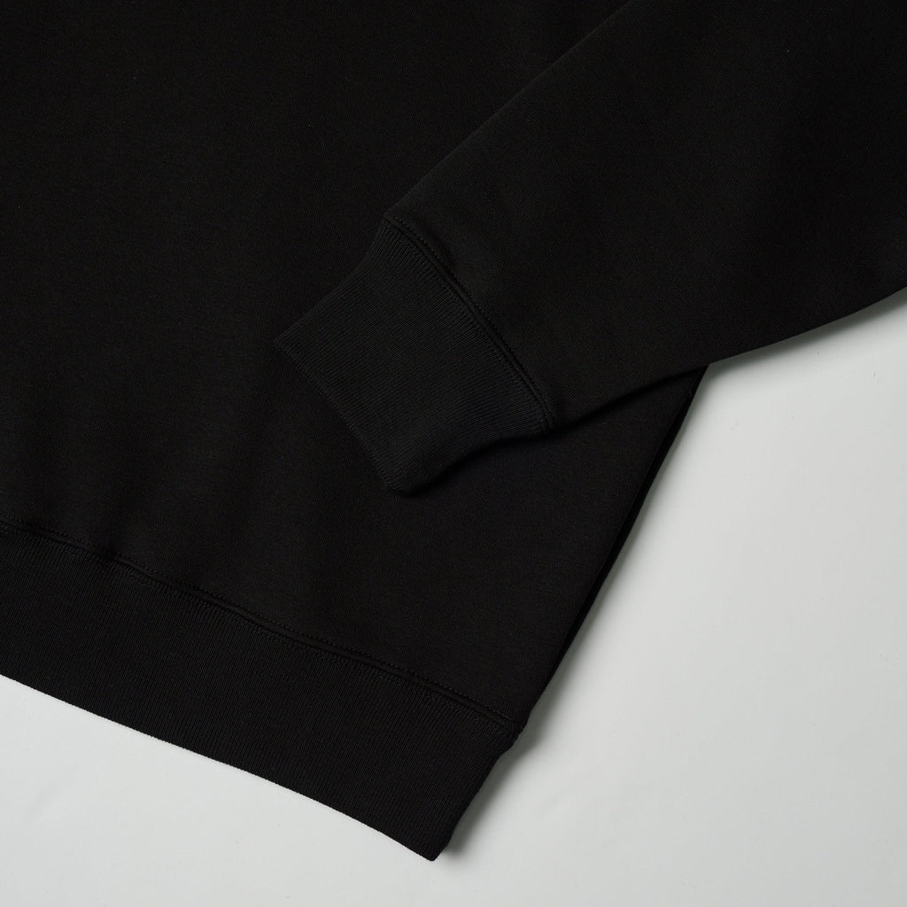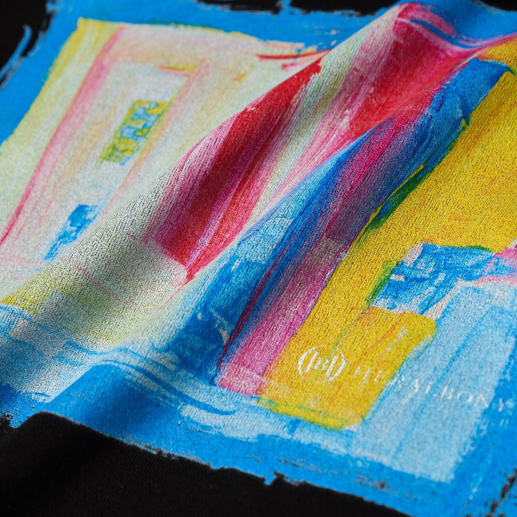 鮮やかな色彩や、勢いのある筆致を主役に、筆づかいをそのまま抜き出したようなトリミングでプリントしました。肉厚なブラックのスウェット生地にアートが唯一無二の存在感を放ちます。