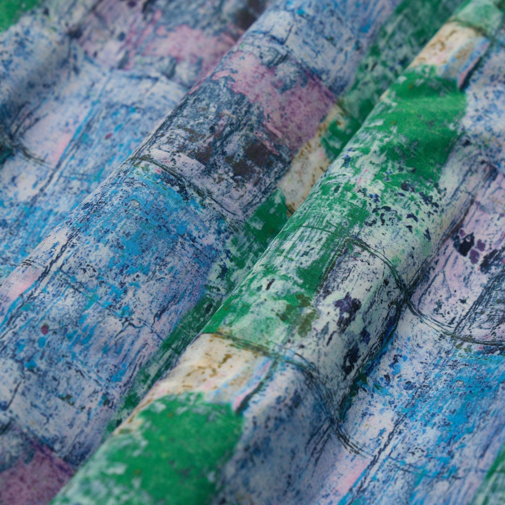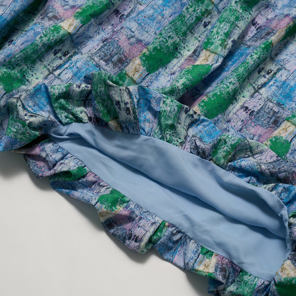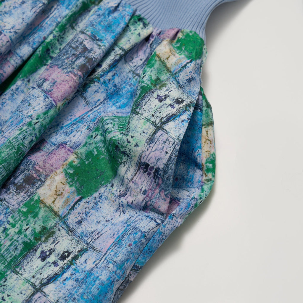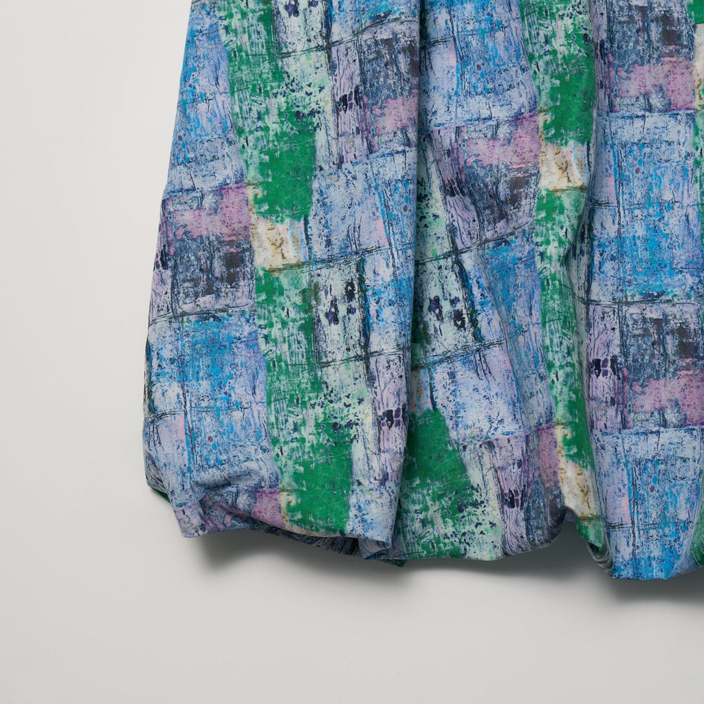 すっきりした上半身と、スカートのバルーンシルエットでメリハリのある佇まいに仕上げました。総柄をあまり着ない方でもお手に取りやすいデザインで、アートを身近に取り入れやすい一枚です。