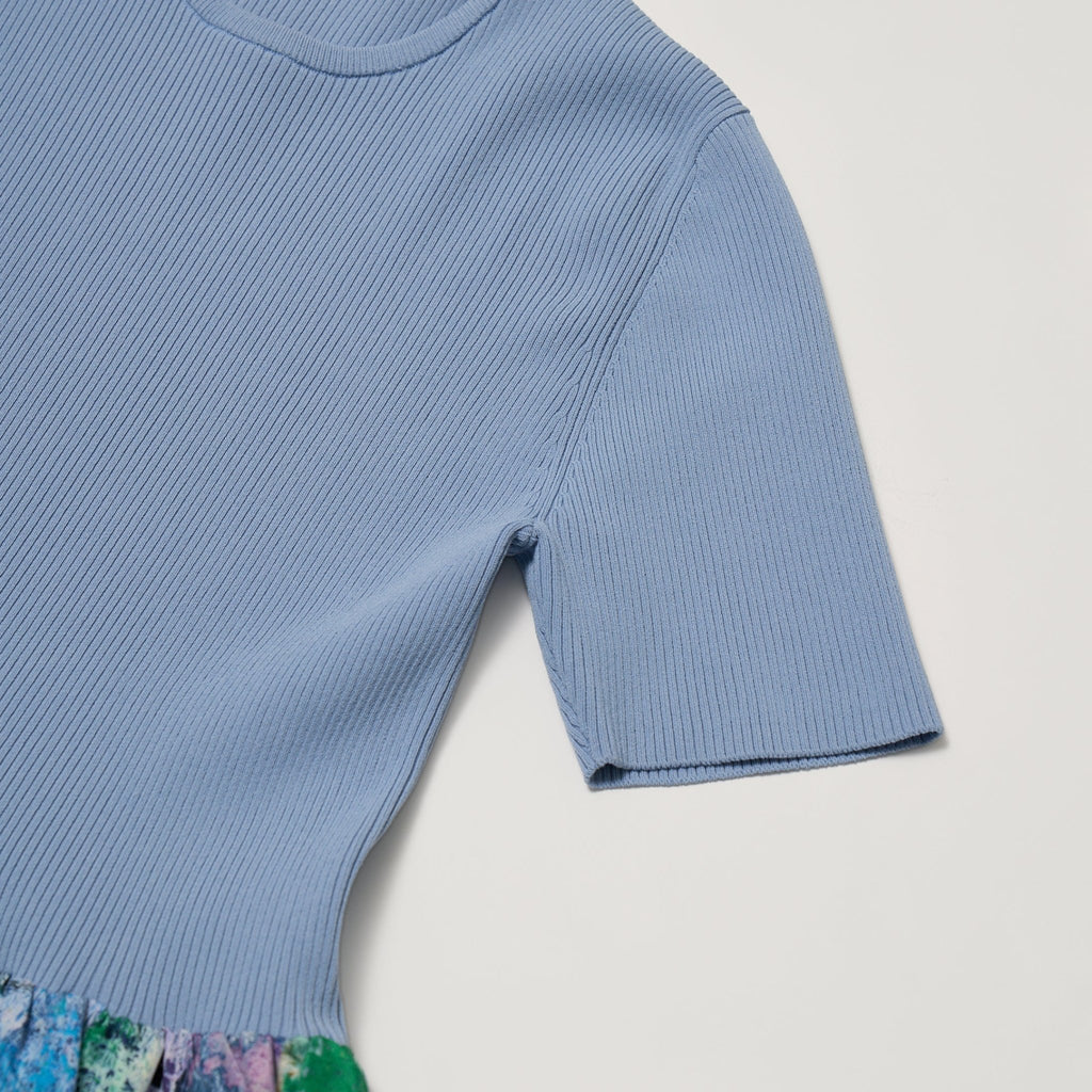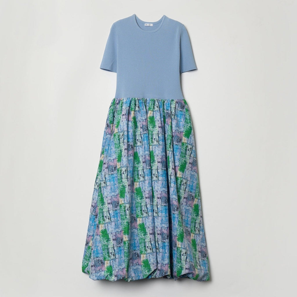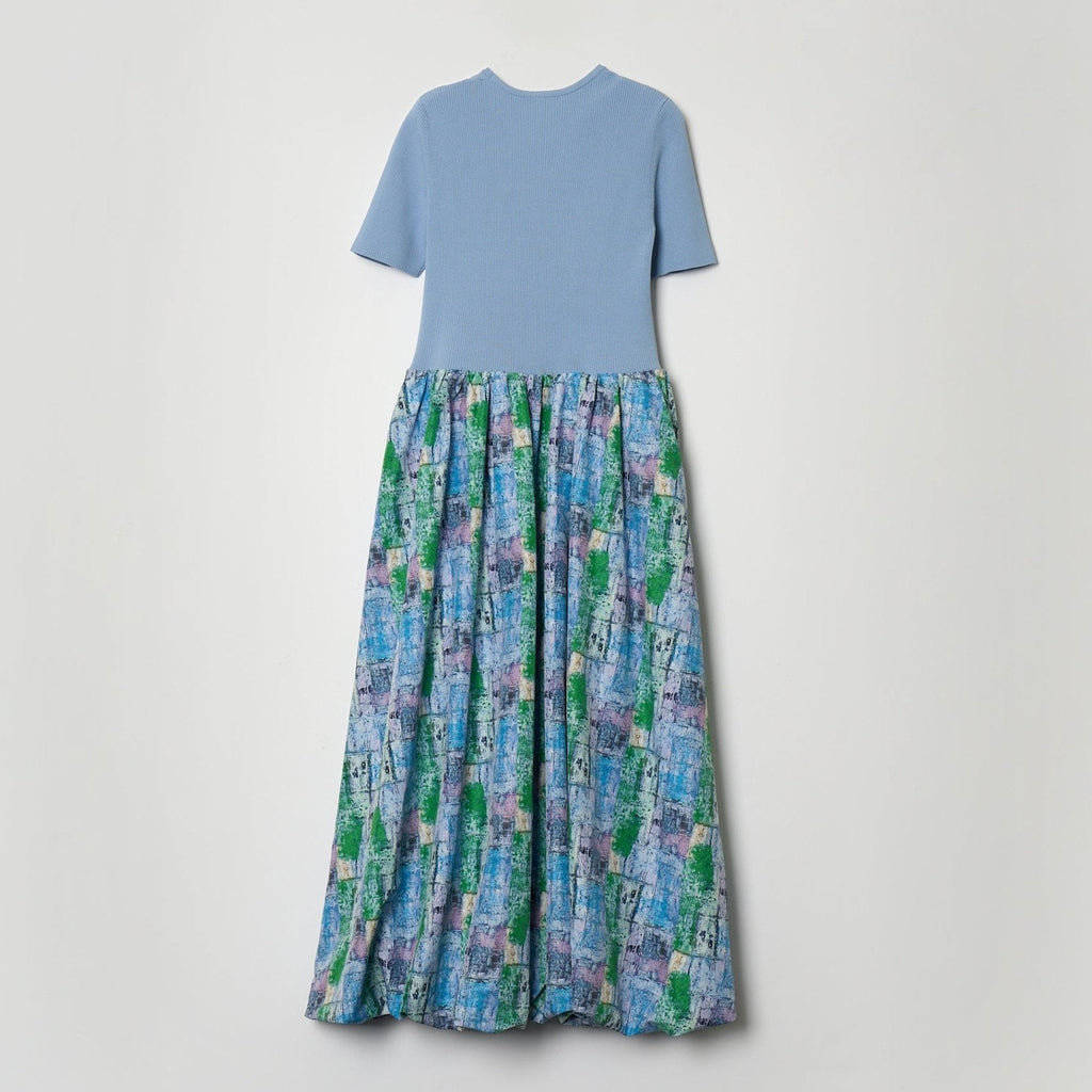 リブニットとふんわりとしたスカートを組み合わせた上品なコンビワンピース。半袖のリブニットで上半身をすっきりと見せながら、スカートのやわらかな立体感がアートの奥深い色彩を際立たせます。