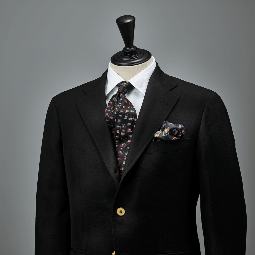 シルク100%の上品な光沢が、スーツスタイルを格上げするポケットチーフ。筆の勢いや筆圧を感じるアートは、折り方や胸ポケットから見せる分量によって、表情の変化を楽しめるのが魅力です。同じアートを起用したネクタイとのコーディネートもおすすめです。