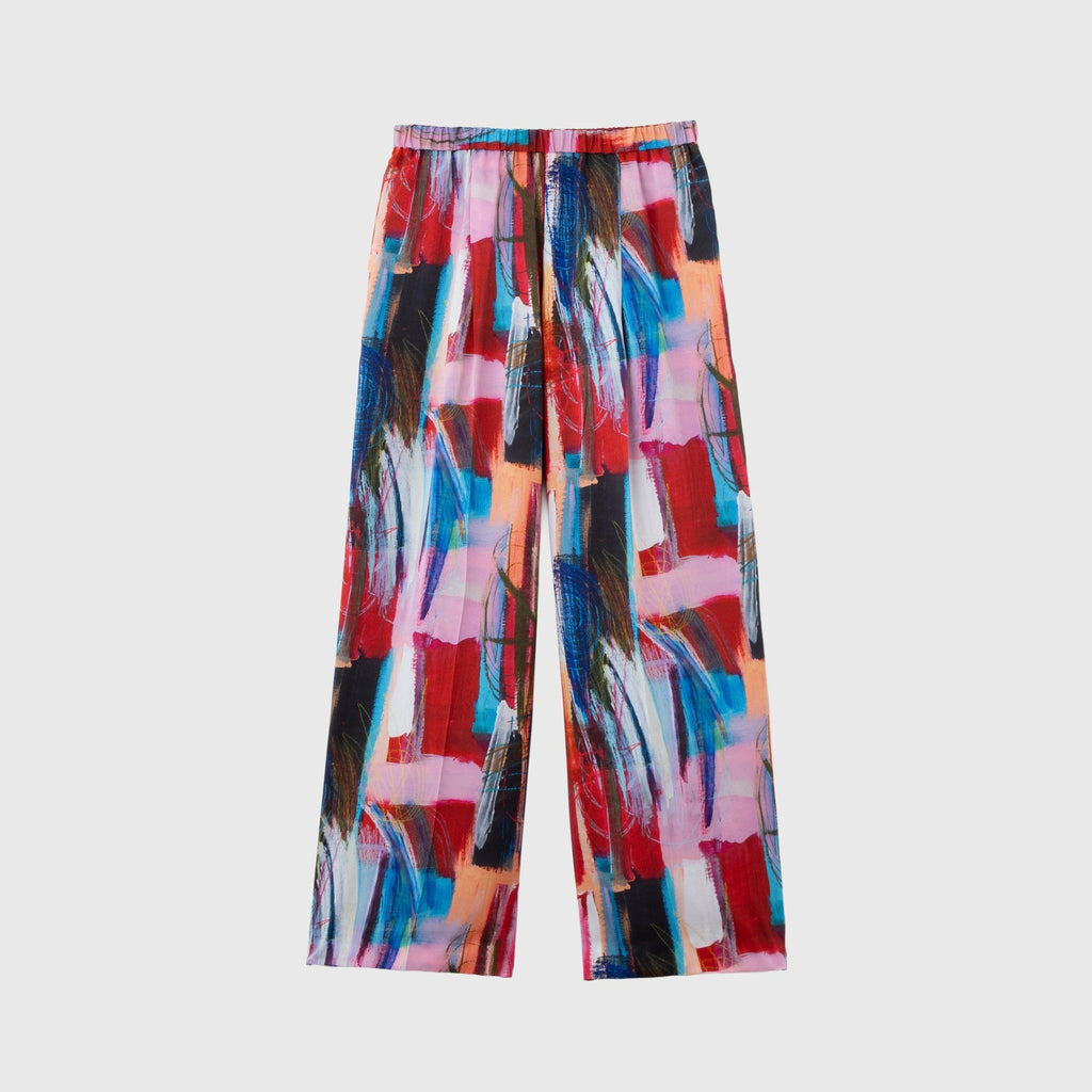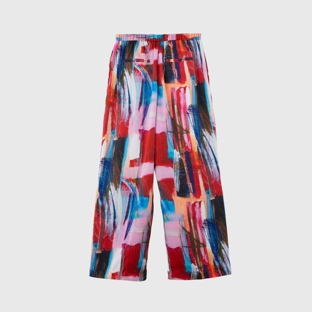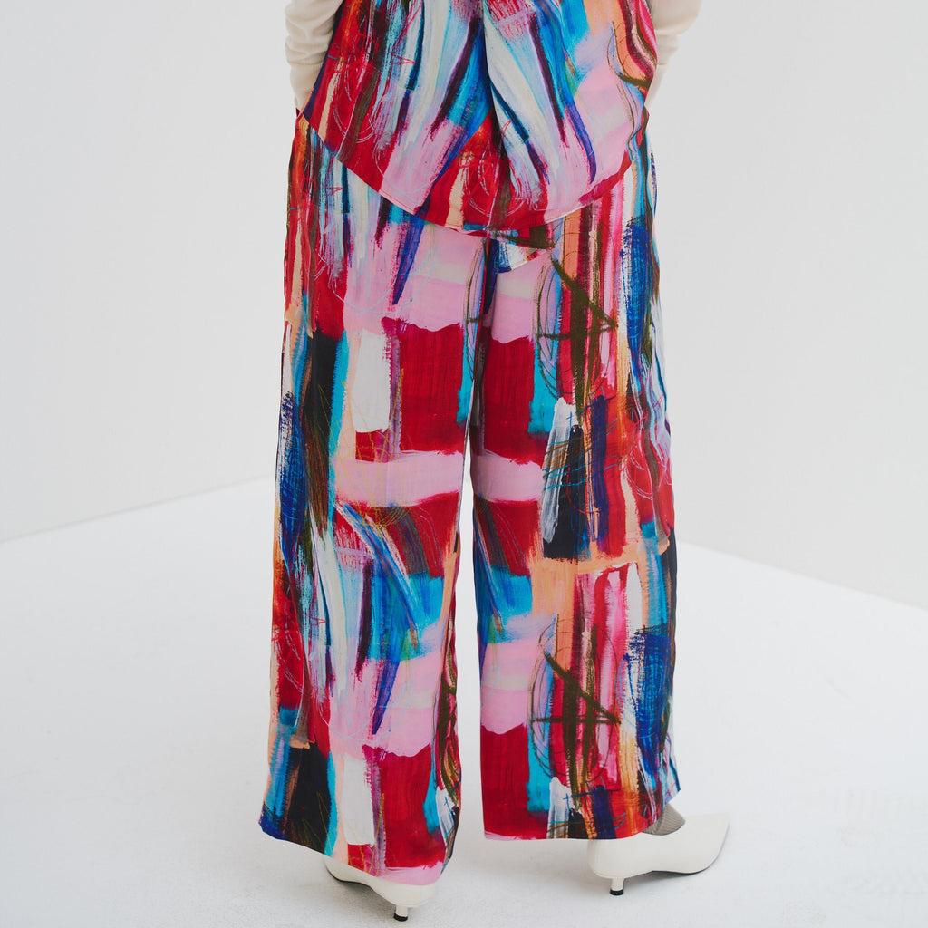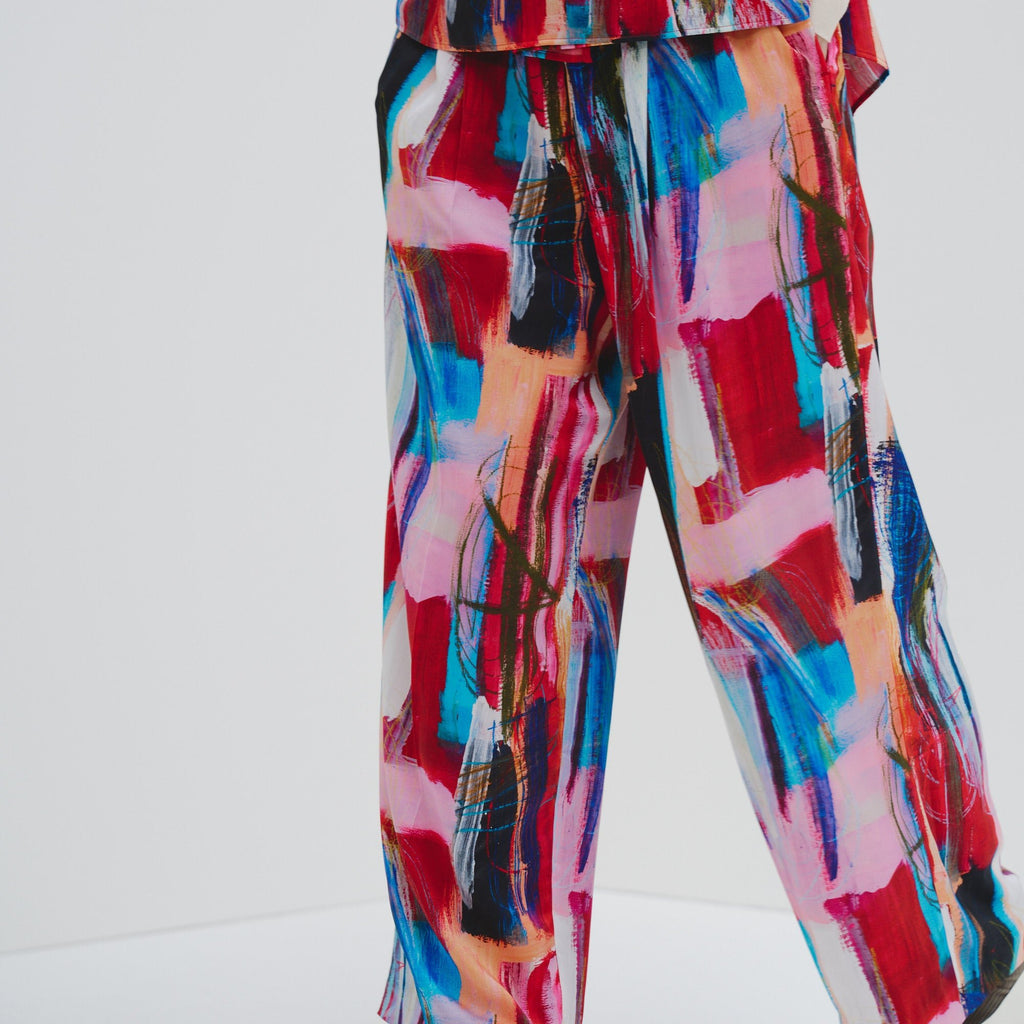 Ce magnifique pantalon est orné d'une œuvre de l'artiste allemande Birte Seidensticker, ce qui en fait la pièce maîtresse de toute tenue. Son pli central lui confère une allure épurée et élégante. La taille est élastique et un cordon de serrage intérieur du même tissu permet un ajustement parfait. Il s'associe parfaitement au chemisier caraco orné de la même œuvre. Il est également doté de poches sur les côtés et aux hanches.