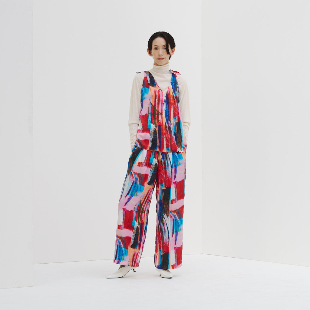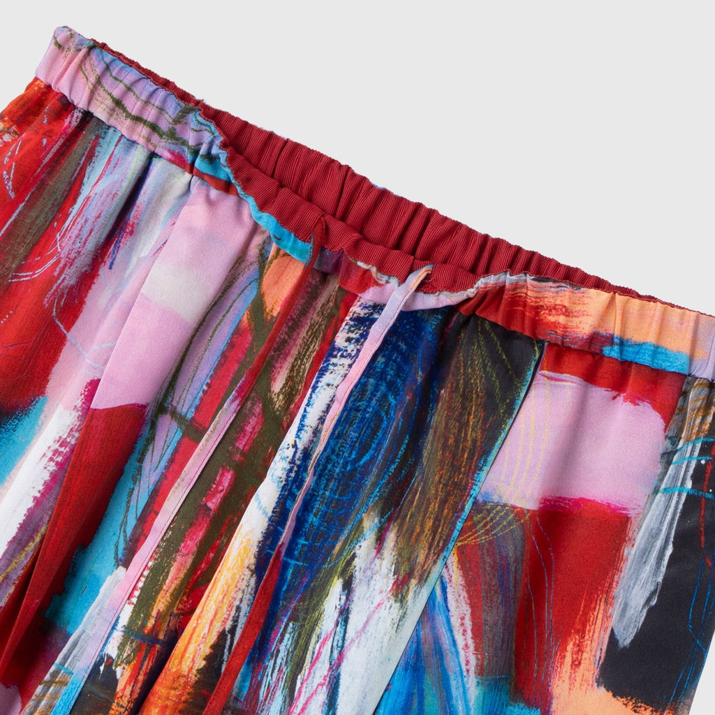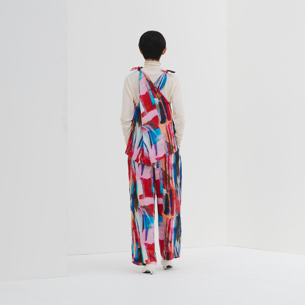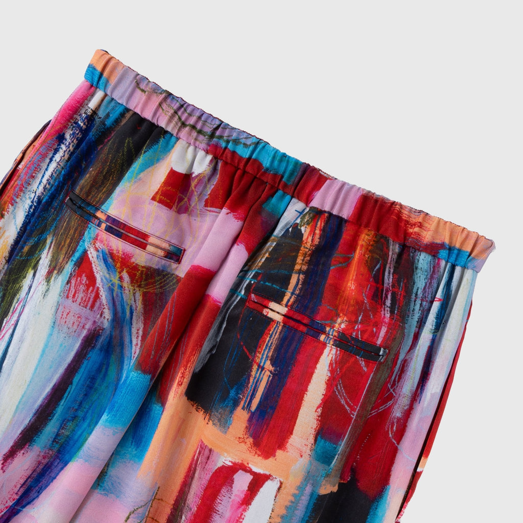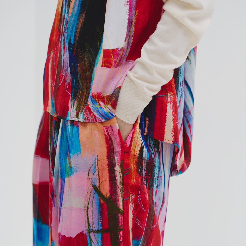 Ce magnifique pantalon est orné d'une œuvre de l'artiste allemande Birte Seidensticker, ce qui en fait la pièce maîtresse de toute tenue. Son pli central lui confère une allure épurée et élégante. La taille est élastique et un cordon de serrage intérieur du même tissu permet un ajustement parfait. Il s'associe parfaitement au chemisier caraco orné de la même œuvre. Il est également doté de poches sur les côtés et aux hanches.
