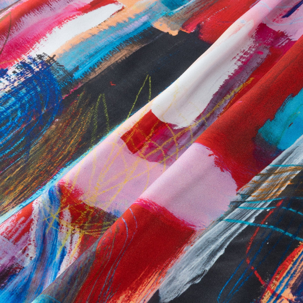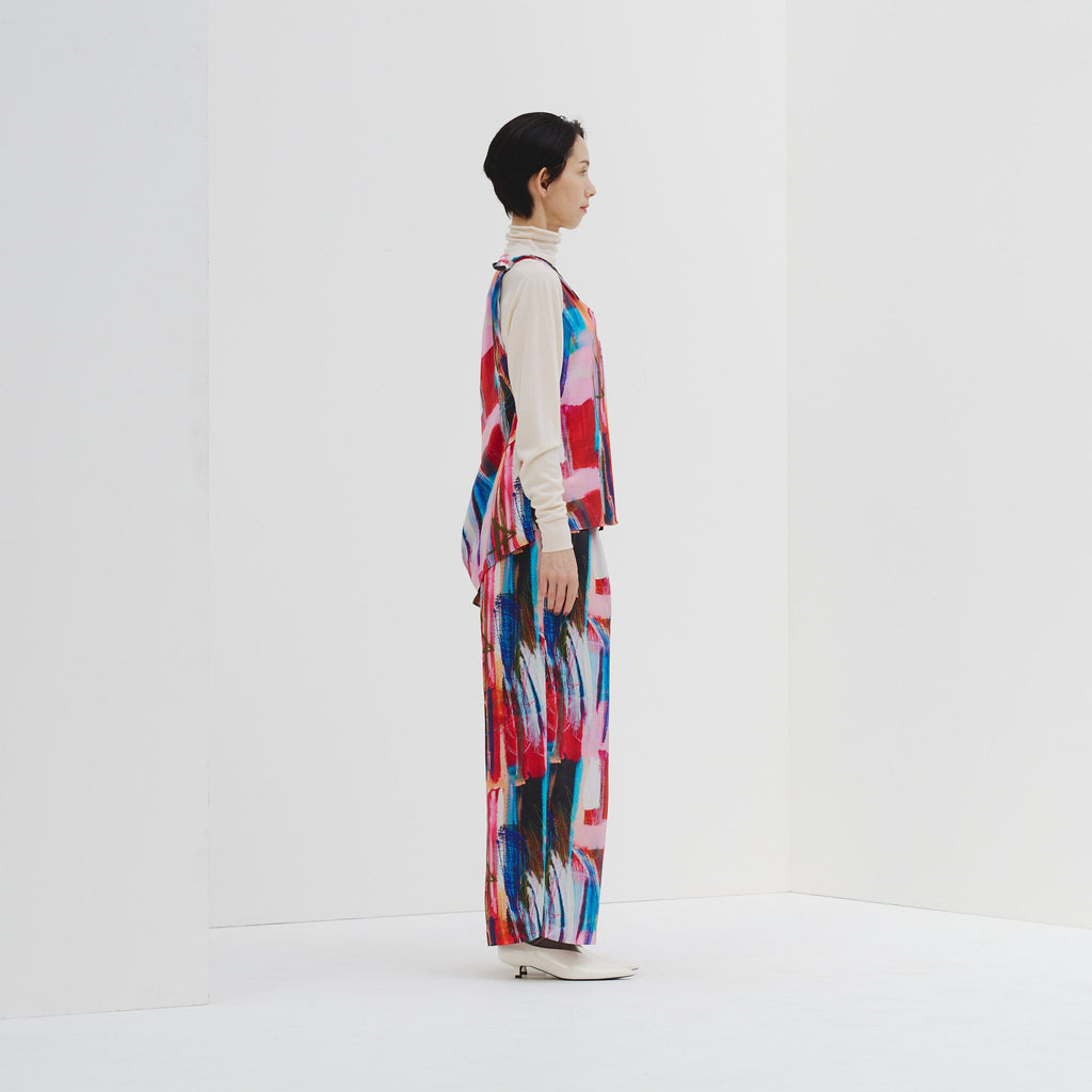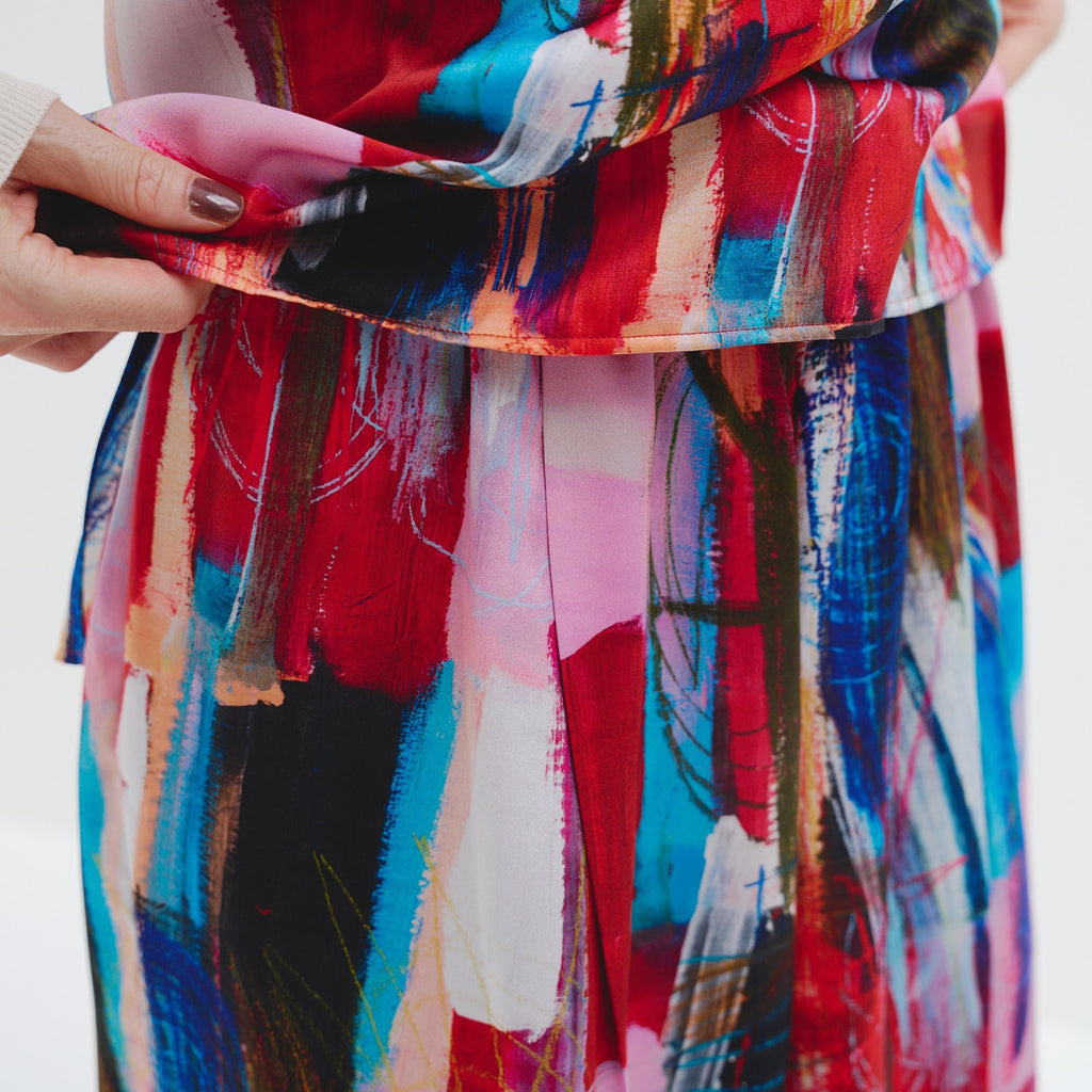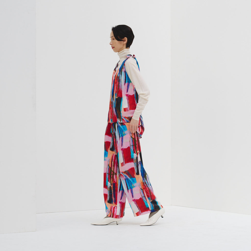 Ce magnifique pantalon est orné d'une œuvre de l'artiste allemande Birte Seidensticker, ce qui en fait la pièce maîtresse de toute tenue. Son pli central lui confère une allure épurée et élégante. La taille est élastique et un cordon de serrage intérieur du même tissu permet un ajustement parfait. Il s'associe parfaitement au chemisier caraco orné de la même œuvre. Il est également doté de poches sur les côtés et aux hanches.