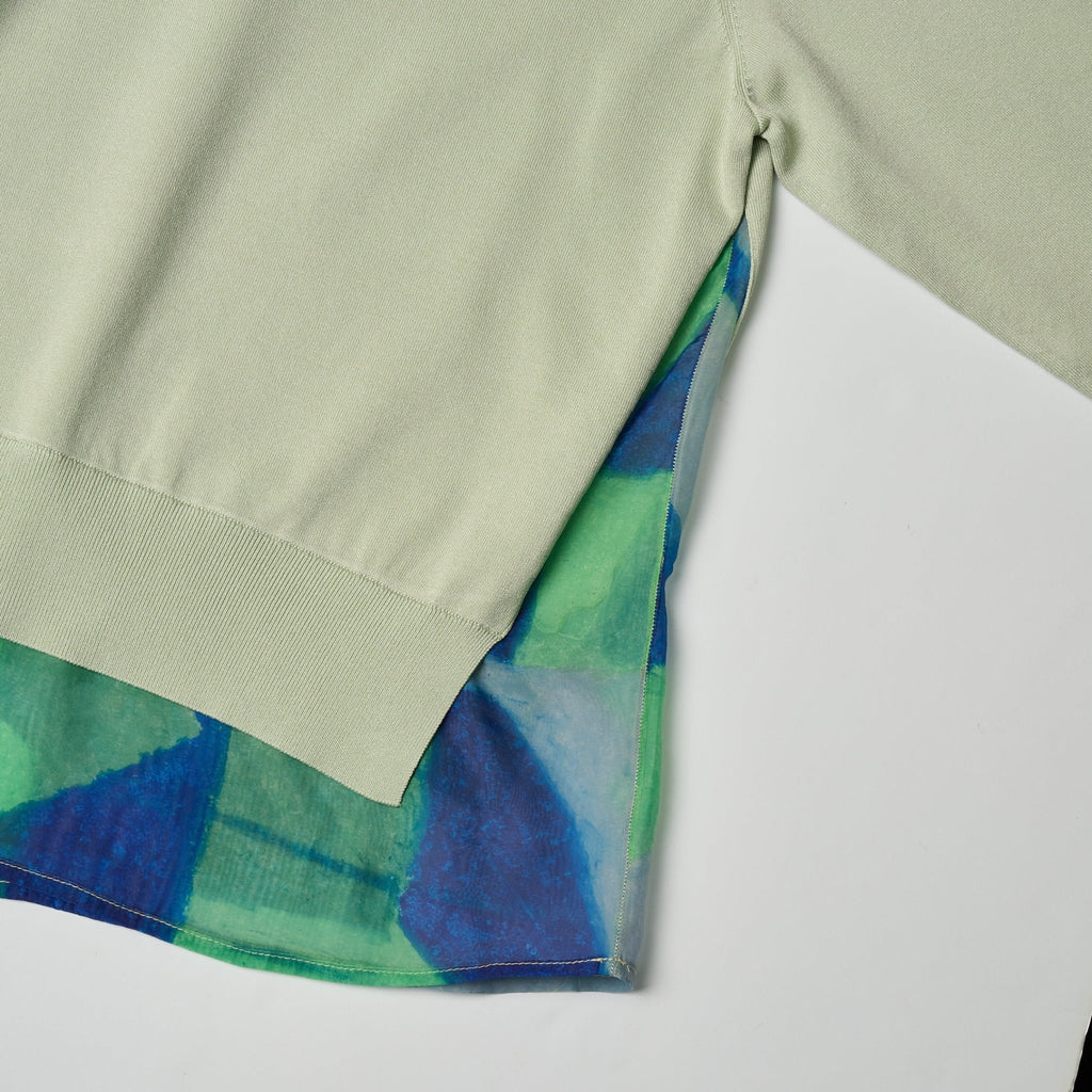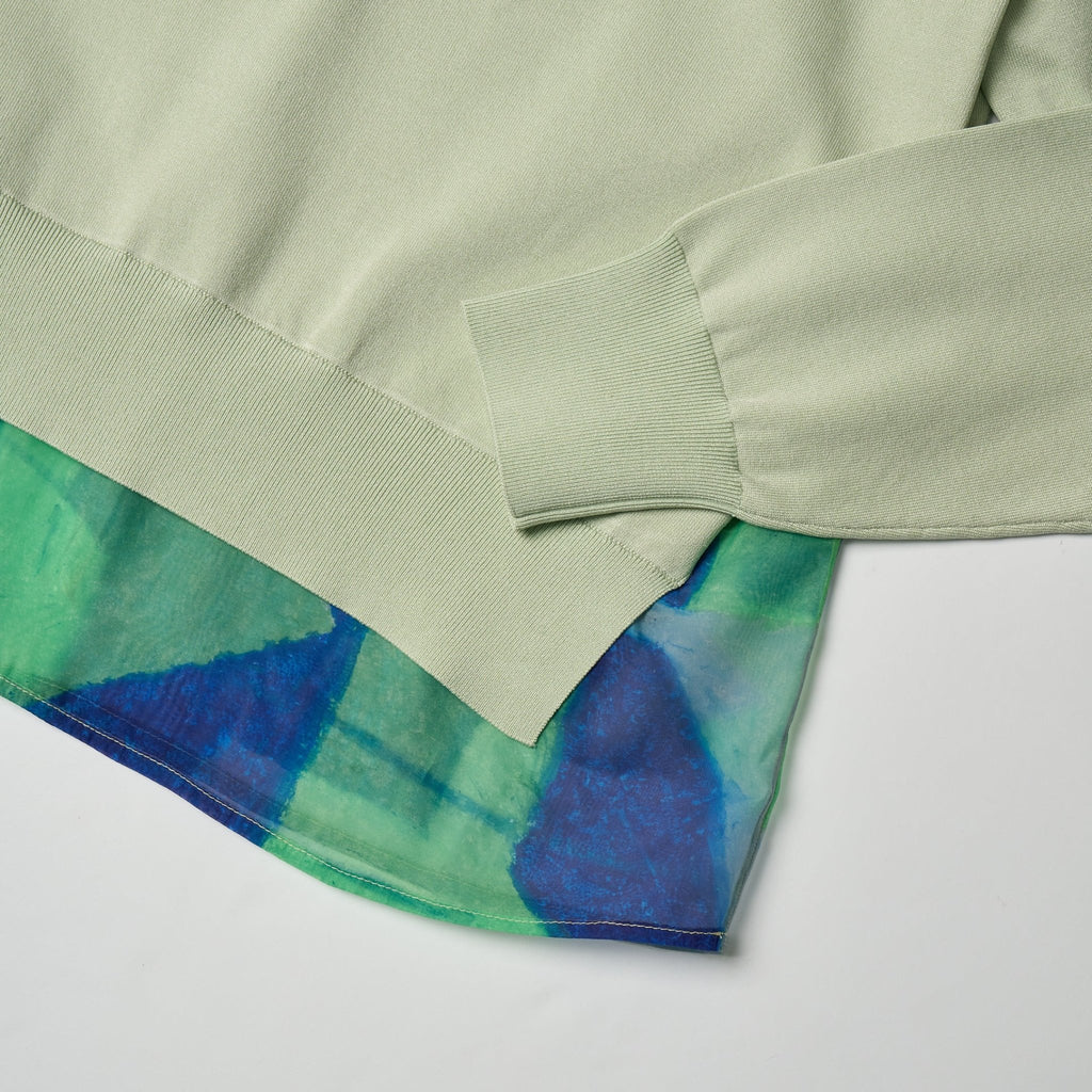 オーガンジーとニットが重なるレイヤード風クルーネック。裾からのぞく軽やかなアートが、スタイリングを簡単に格上げしてくれます。ニットはドライタッチな質感で、夏まで着られるさらっとした着心地。オーガンジー部分はやや長めの着丈で、ヒップをカバーしてくれます。