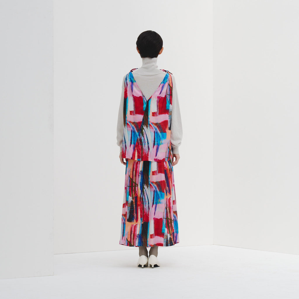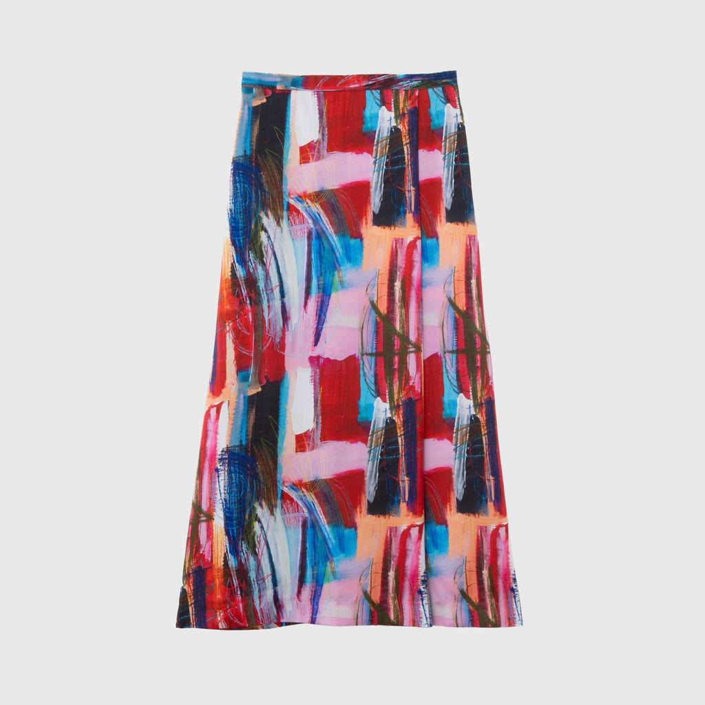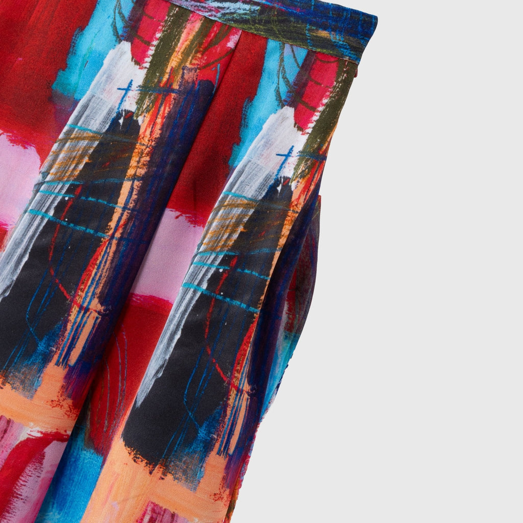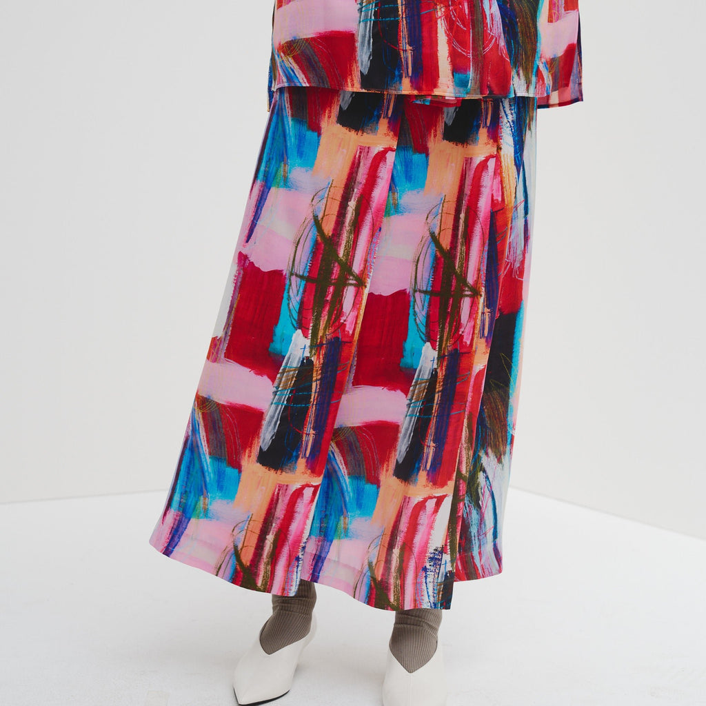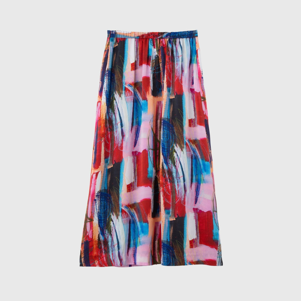 Cette jupe plissée fendue est ornée d'une magnifique œuvre de l'artiste allemande Birte Seidensticker. Les fentes latérales lui confèrent une touche d'élégance et de décontraction. Le dos élastique lui confère un look raffiné tout en offrant une coupe décontractée. Elle se marie parfaitement avec un chemisier caraco orné du même motif. Elle est également dotée de poches latérales.