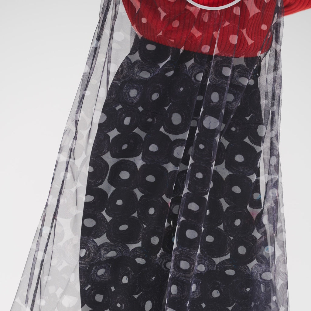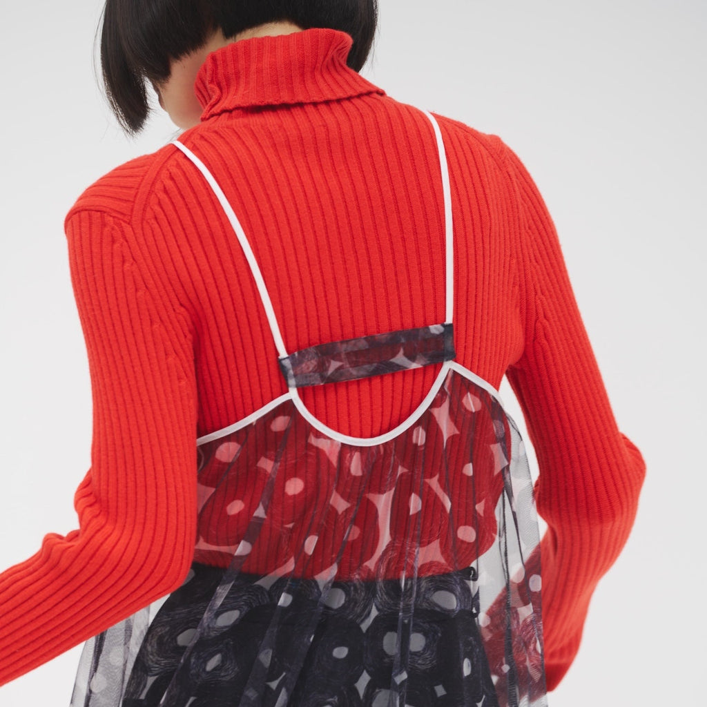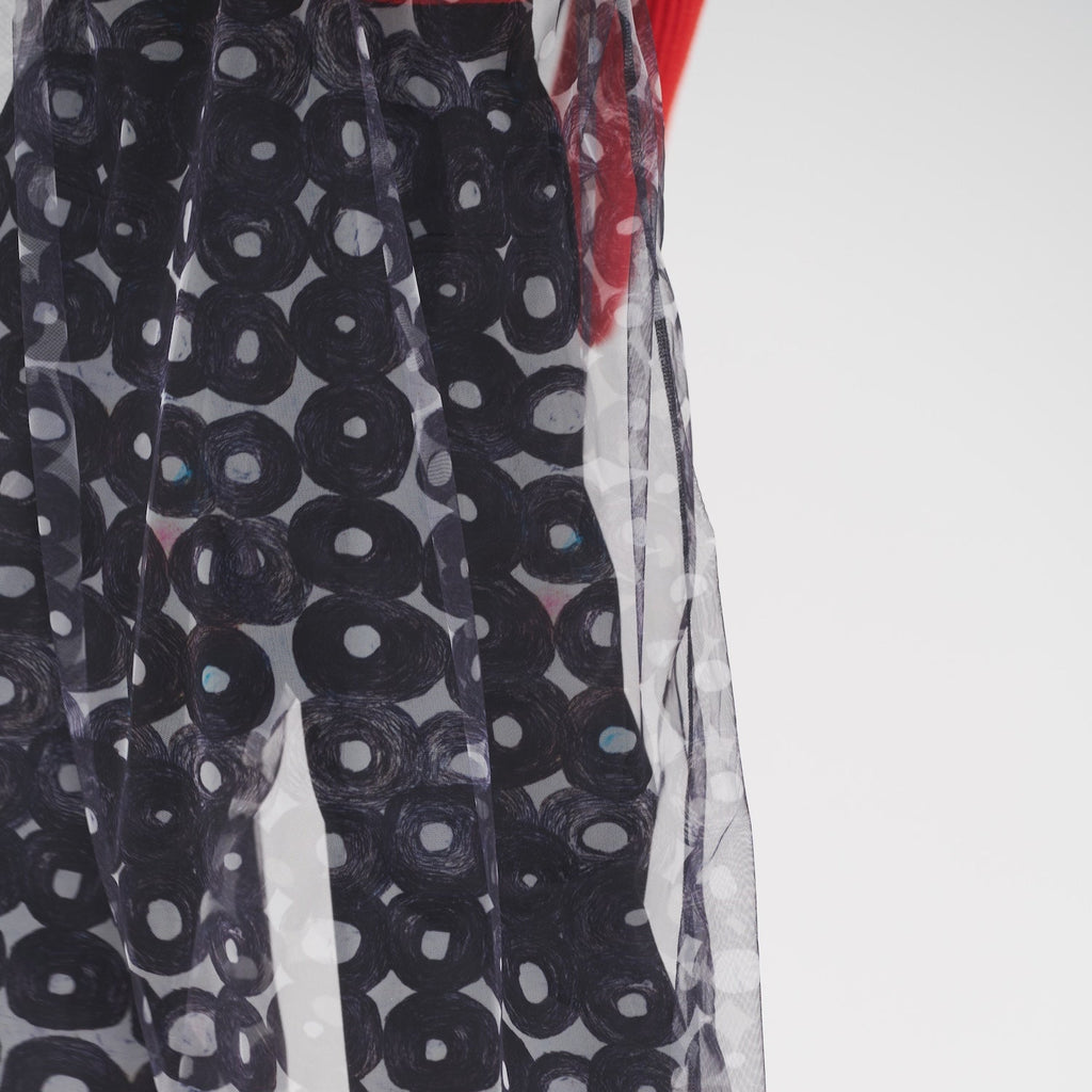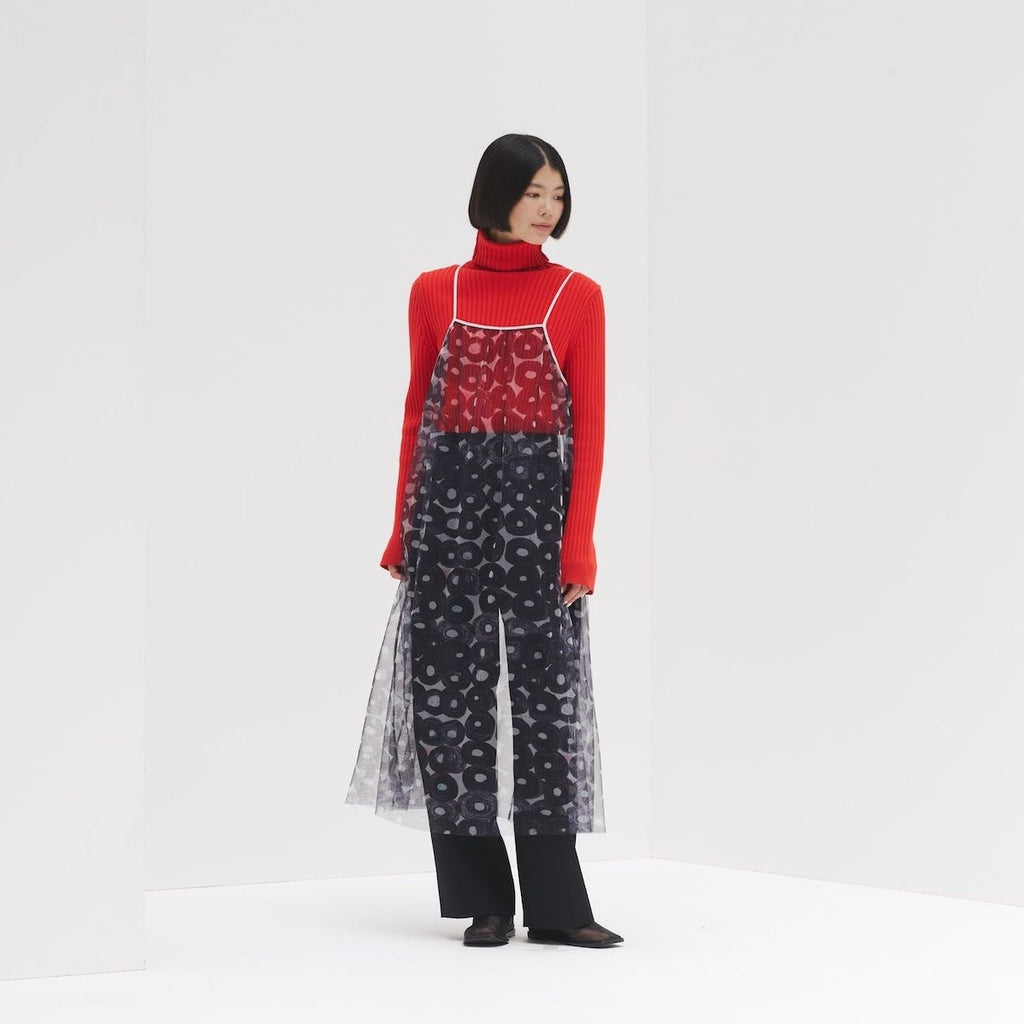 Trendy tulle material is transformed into a unique item with its distinctive artwork. This camisole dress is made from supple tulle and features a sheer, distinctive artwork. You can enjoy a variety of styles depending on what you layer it with. The generous amount of fabric gathered in the front and back adds a touch of shimmering art.