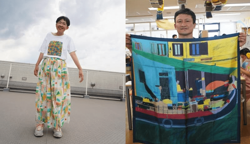 Hiroshi Yoshida, with a dignified expression, is holding up a scarf featuring an artwork called "Venice's Fruit Boat." Yoshida's colored pencil drawings of cityscapes from around the world create a somewhat pop atmosphere by layering the colors multiple times.