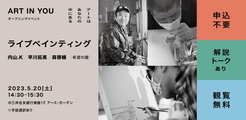 A live painting event will be held by three artists, Uchiyama.K, Hayakawa Takuma, and Mori Keisuke, who are all members of Kibo no Sono, a welfare facility in Mie Prefecture.
