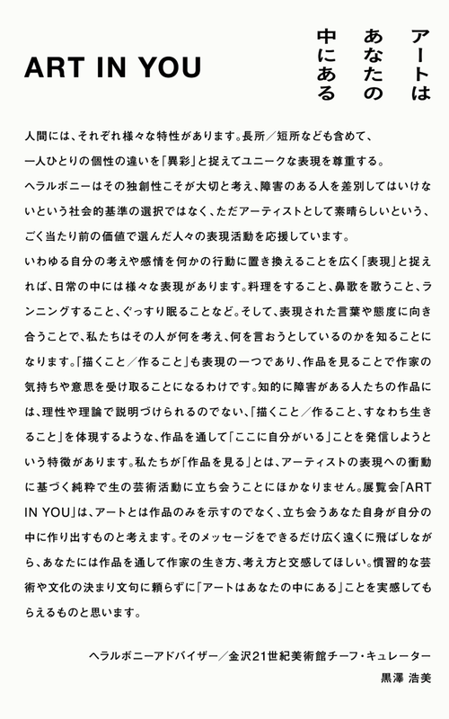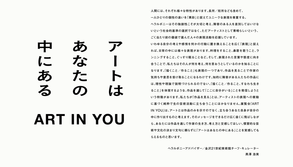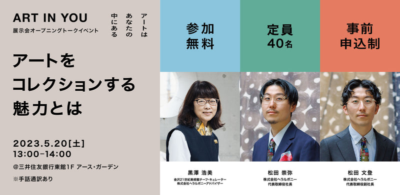 As an opening talk for the exhibition "ART IN YOU - Art is inside you" organized by HERALBONY, the exhibition curator/Chief Curator of Kanazawa 21st Century Art Museum, Hiromi Kurosawa, and both representatives of HERALBONY, Takaya Matsuda and Fumito Matsuda, will deliver a special talk.