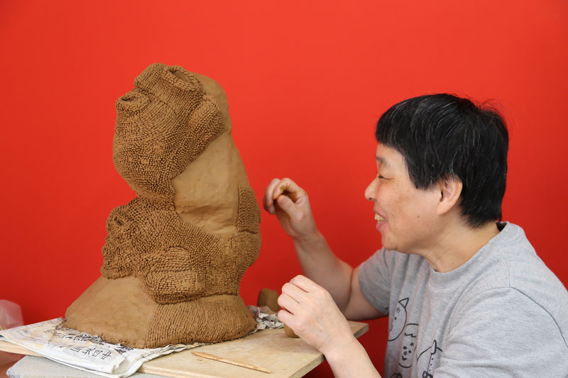 Born in 1966. Lives in Shiga Prefecture. Has been with Yamanami Studio since 1985. Not good at expressing her feelings to others, she continues to create sculptures of people she wants to attract their attention as a communication tool. All of her models are men she has feelings for. First, she decides on the subject and prepares the base shape, then carefully embeds the entire surface with fine rice-grain-sized clay. Large pieces can take more than two months to complete, and the countless grains cover the entire piece, transforming it into various shapes. She wants to be recognized by the person she loves. Even now, this feeling is what drives her creations.