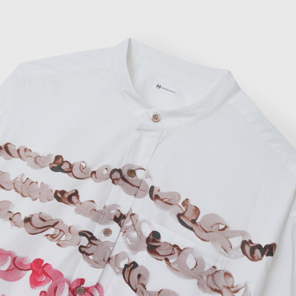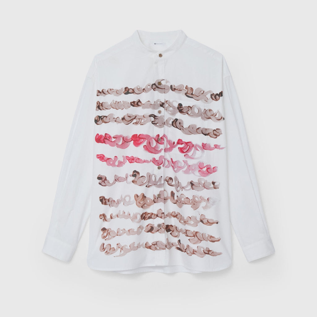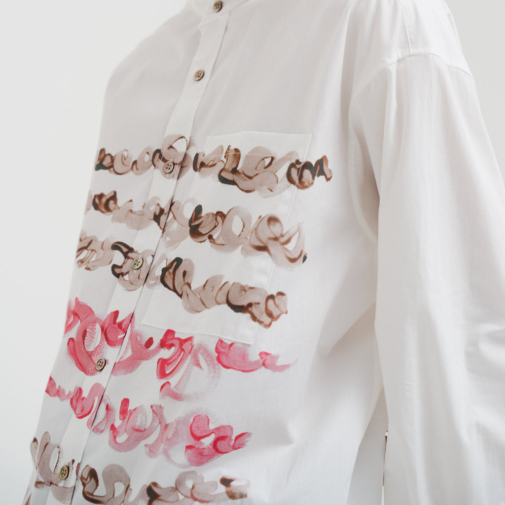 ボーダー柄のように作家・marinaの「marina moji」を配した長袖シャツ。すっきりしたバンドカラーで、スカーフなどの小物を使ったアレンジもしやすい一着です。身体のラインを拾わないユニセックスなシルエットで、インナーにニットを着たり、フロントを開けて羽織として着たりなど、幅広いスタイリングが可能です。