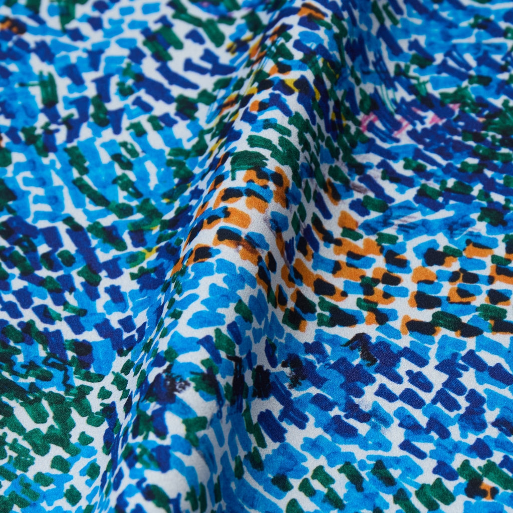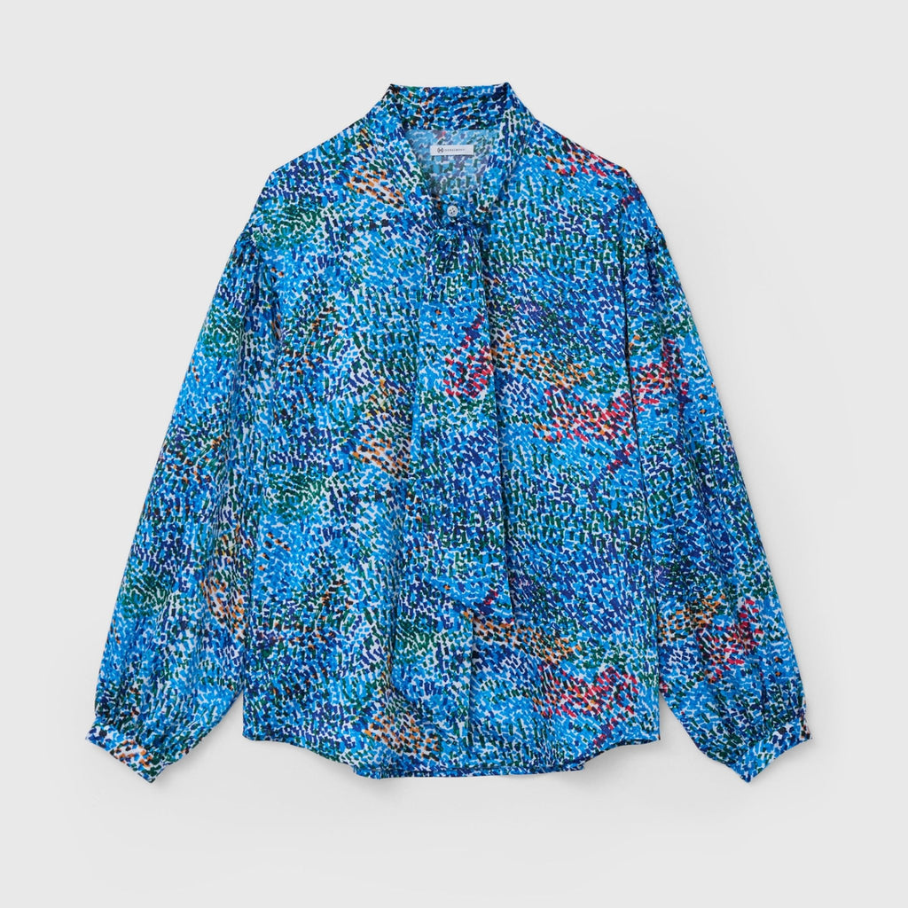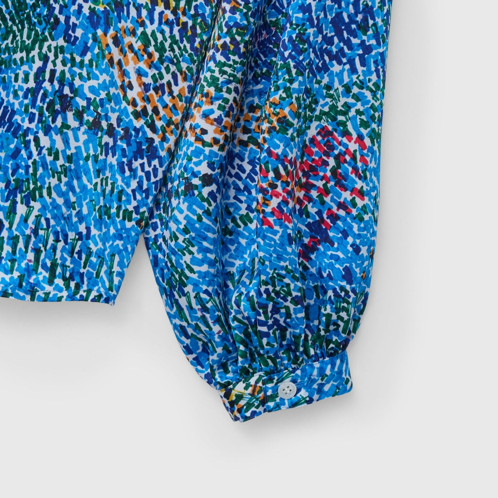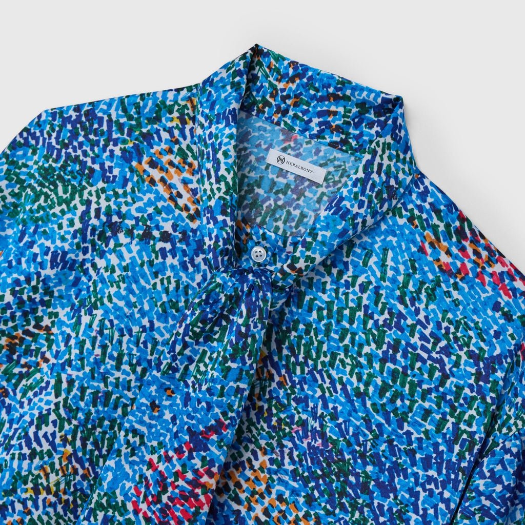 ほのかな光沢を感じるクレープサテンにアートをプリントし、オフィスやオケージョンでも着用できる総柄ブラウスに仕上げました。ハリ感のあるやや肉厚な素材感です。