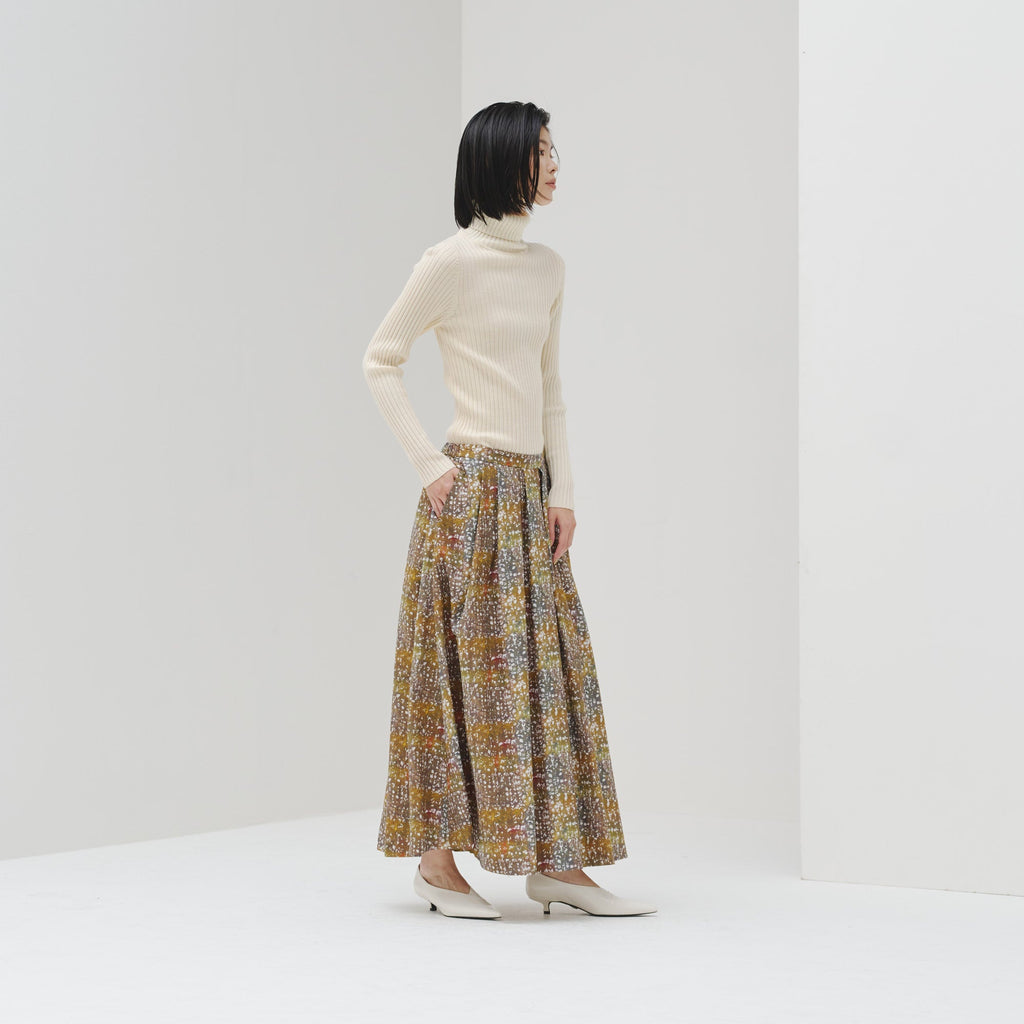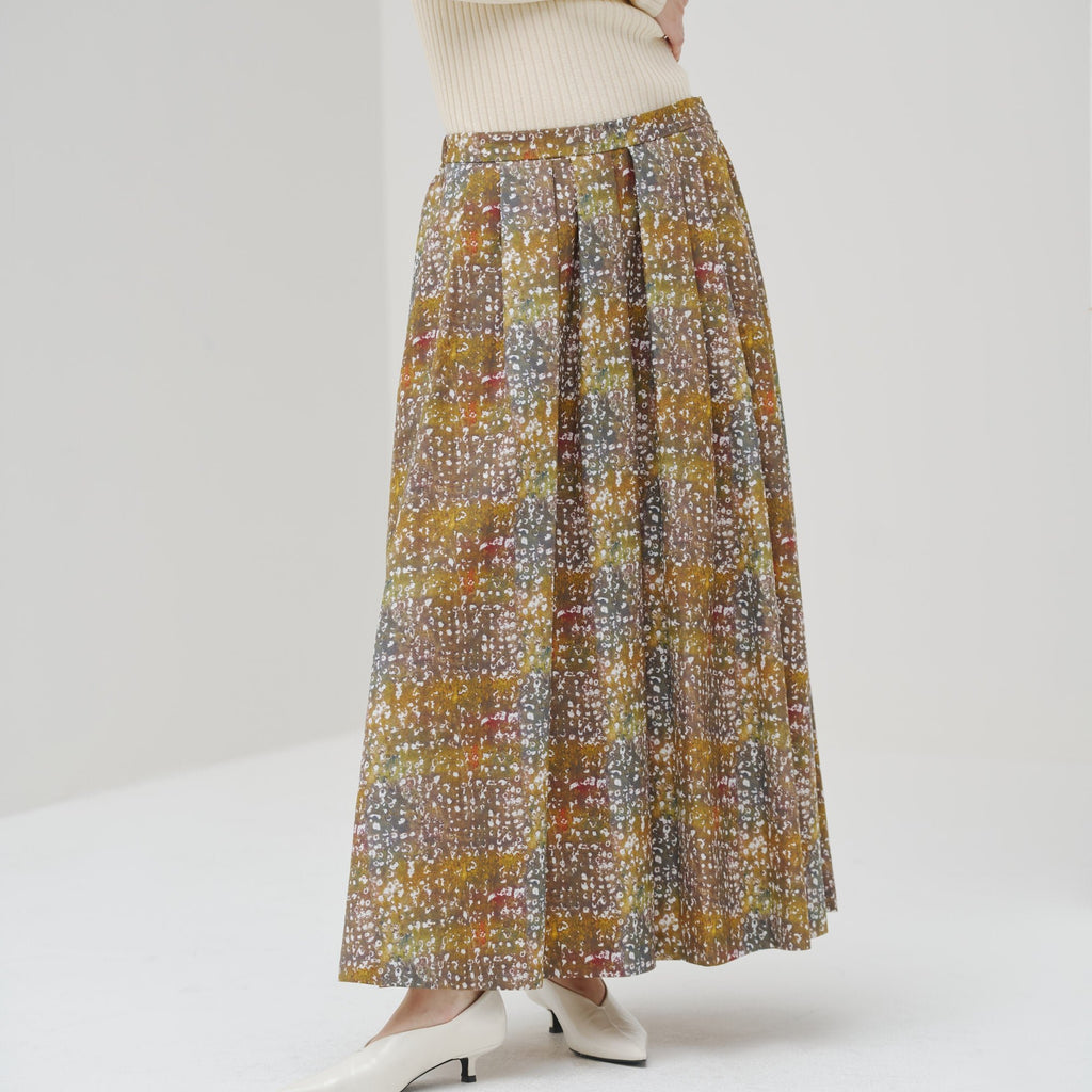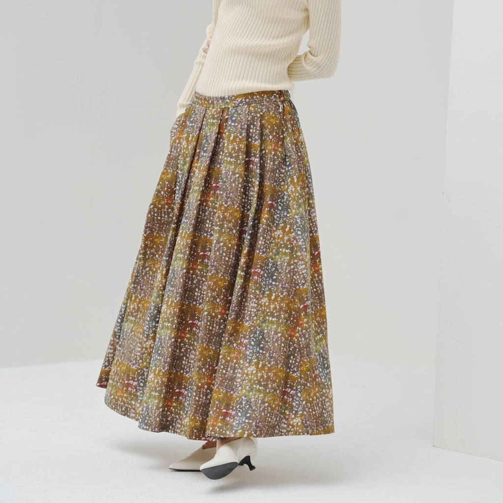 Our popular flared skirt has been updated with a crisp fabric. The random tucks create a light, flowing silhouette, and the elastic waistband ensures a comfortable fit.