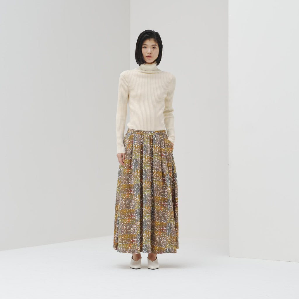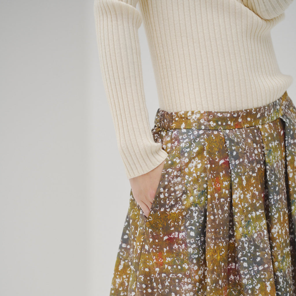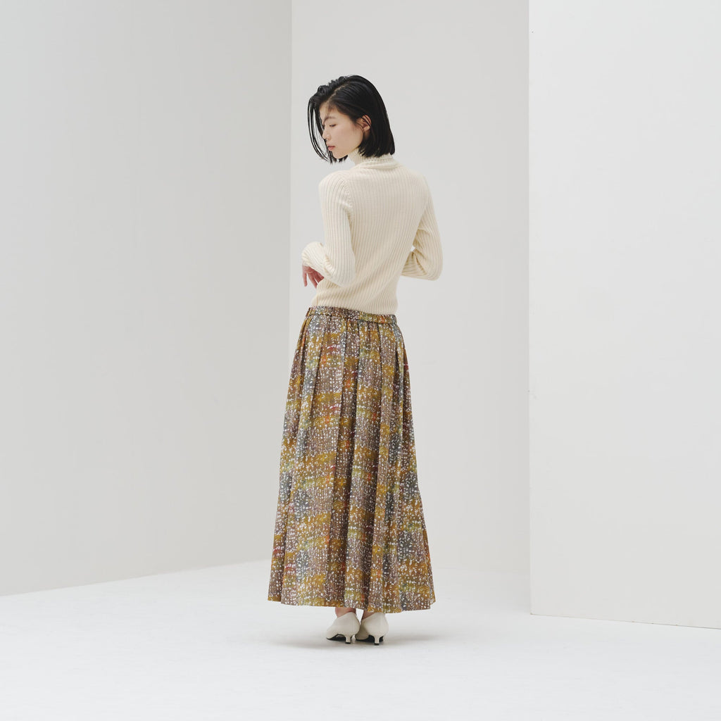 Our popular flared skirt has been updated with a crisp fabric. The random tucks create a light, flowing silhouette, and the elastic waistband ensures a comfortable fit.
