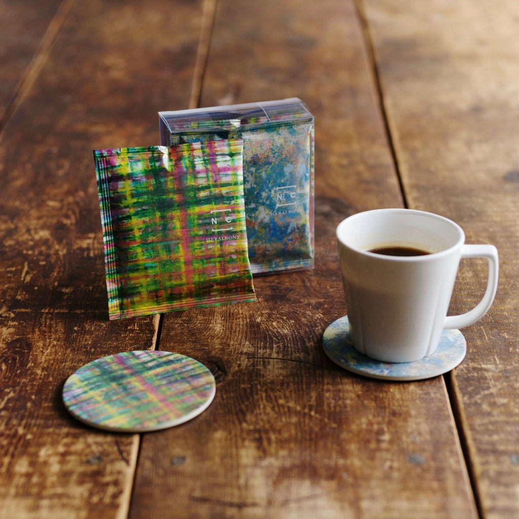 ドリップバッグコーヒーとアートコースターがセットになったギフトBOX。ドリップバッグは世界中のファンに愛される岩手・盛岡の「Nagasawa COFFEE」とコラボレーションしたオリジナルブレンドです。ドリップバッグと同じアートを起用したコースターは洗って何度もお使いいただけます。香り豊かなコーヒーと鮮やかなアートが紡ぐひとときをお楽しみください。