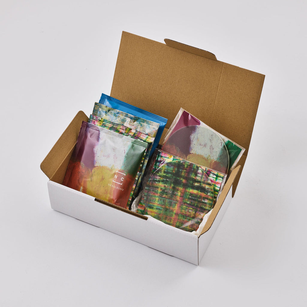 ご自宅でコーヒーとアートによる安らぎの時間を楽しめるドリップバッグとコースターを、プレゼントとして贈りやすいBOXにセットしました。ドリップバッグとコースターのセットのほか、コースターのみのセットもご用意しています。