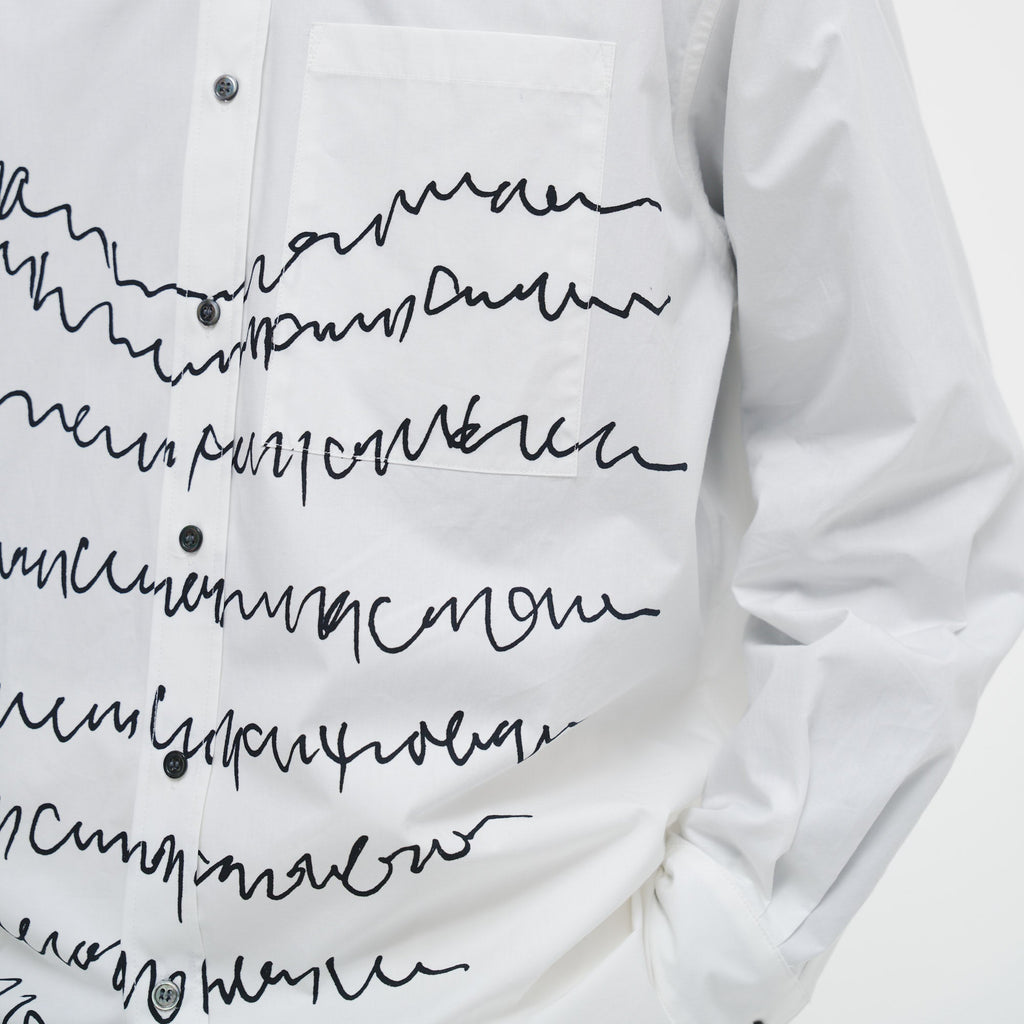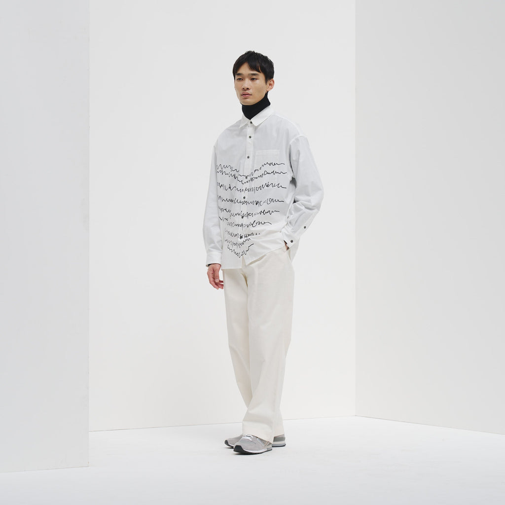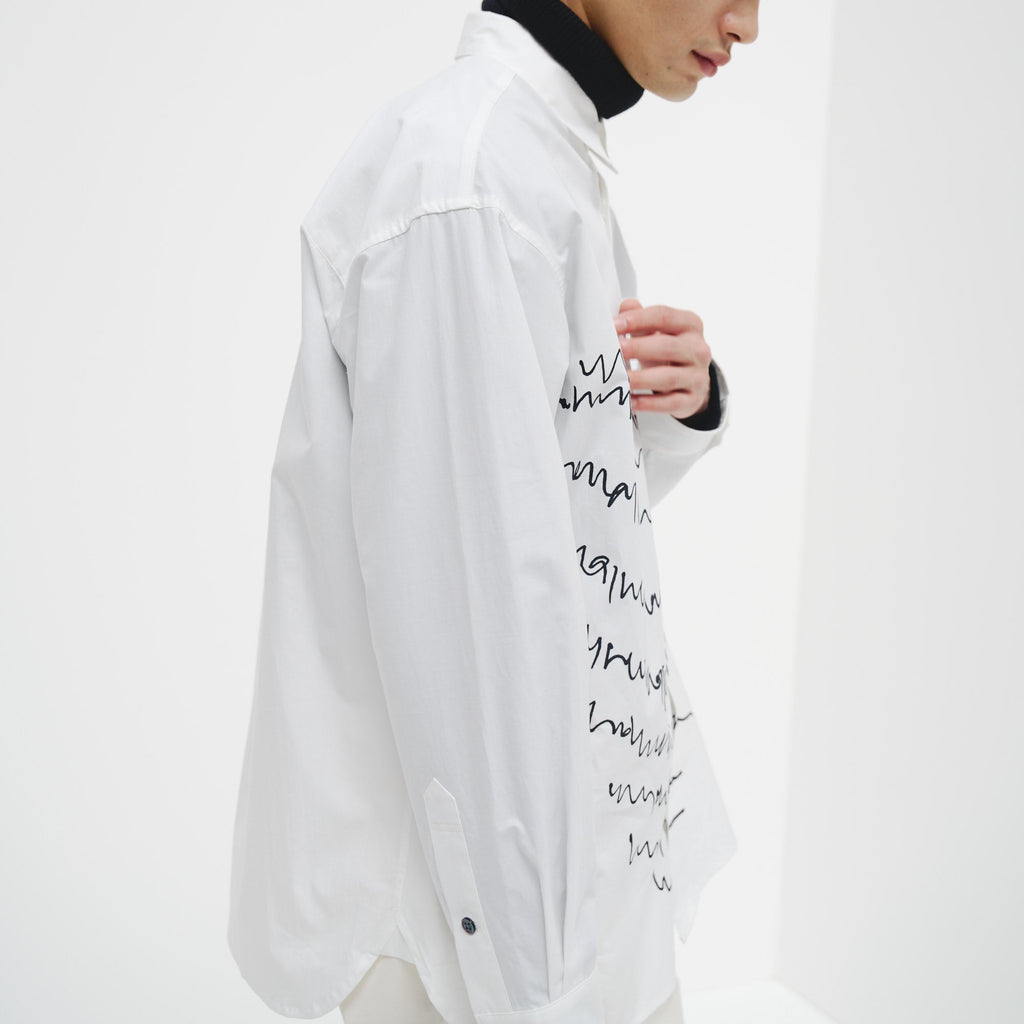 フロントにアートを配置したレギュラーカラーの長袖シャツ。身体のラインを拾わないユニセックスなシルエットで、インナーにニットを着たり、フロントを開けて羽織として着たりなど、幅広いスタイリングが可能です。