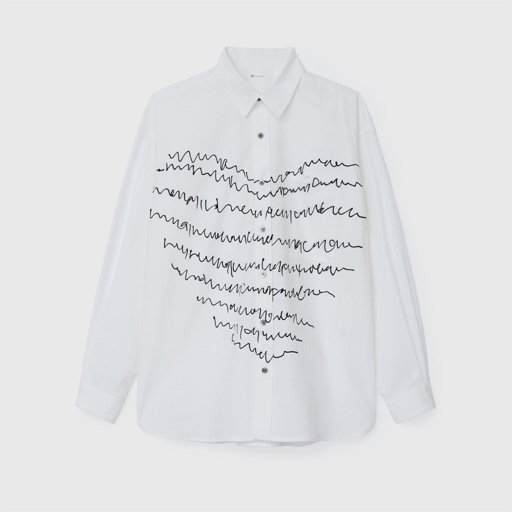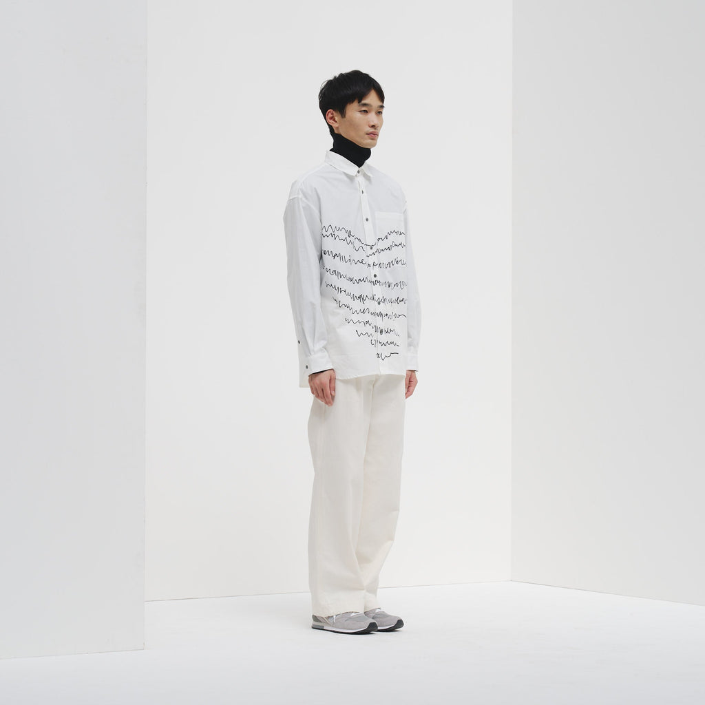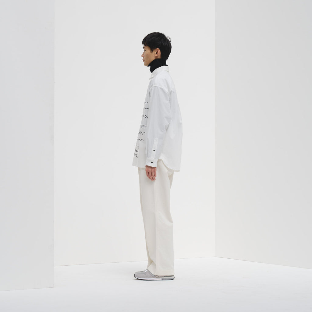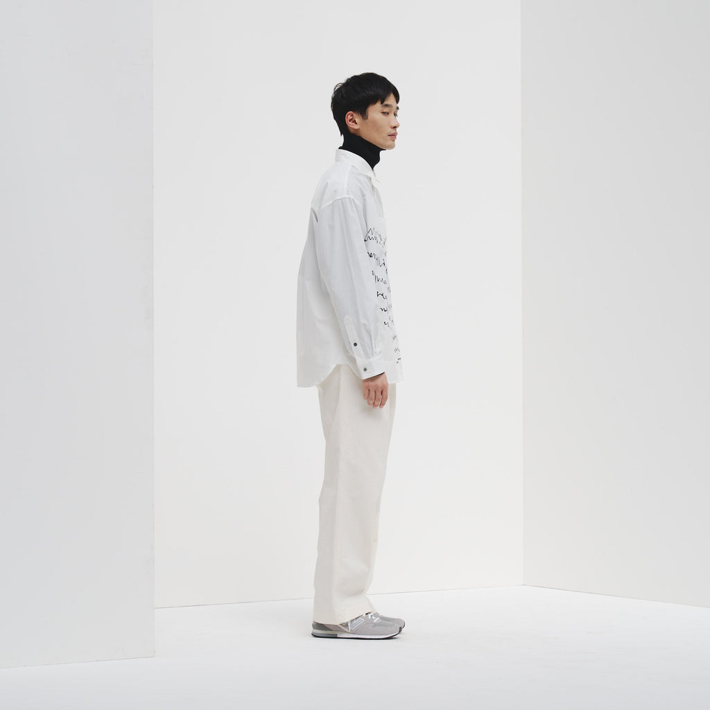 フロントにアートを配置したレギュラーカラーの長袖シャツ。身体のラインを拾わないユニセックスなシルエットで、インナーにニットを着たり、フロントを開けて羽織として着たりなど、幅広いスタイリングが可能です。
