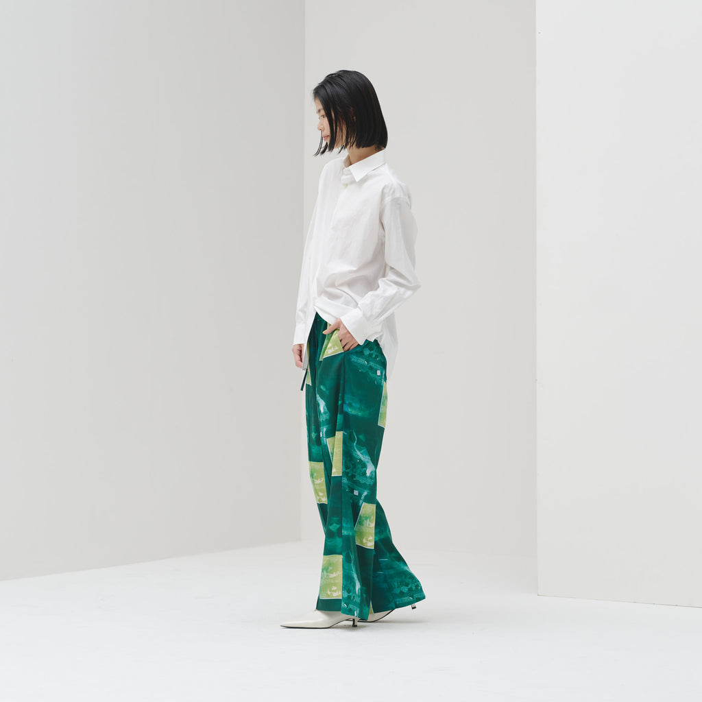 より柔らかな素材で生まれ変わったサテン生地のパンツ。ウエストはゴム入りで、リボンでサイズを調整できます。すとんと落ちるようなシルエットの美しさにこだわり、ジャケットやシャツとも合わせやすいデザインに仕上げました。