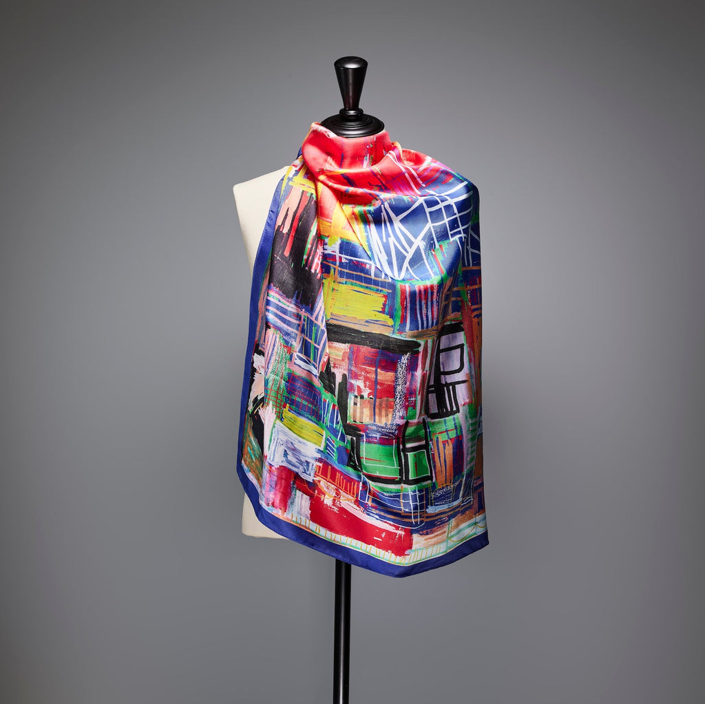 製造工程から見直しを図り、「表も裏も美しい」スカーフに仕上がりました。作品のエネルギーを失うことなく再現するため、シルク素材100%にこだわり、ハリのあるなめらかな肌触りで、首に巻いたときの心地よさも特徴です。