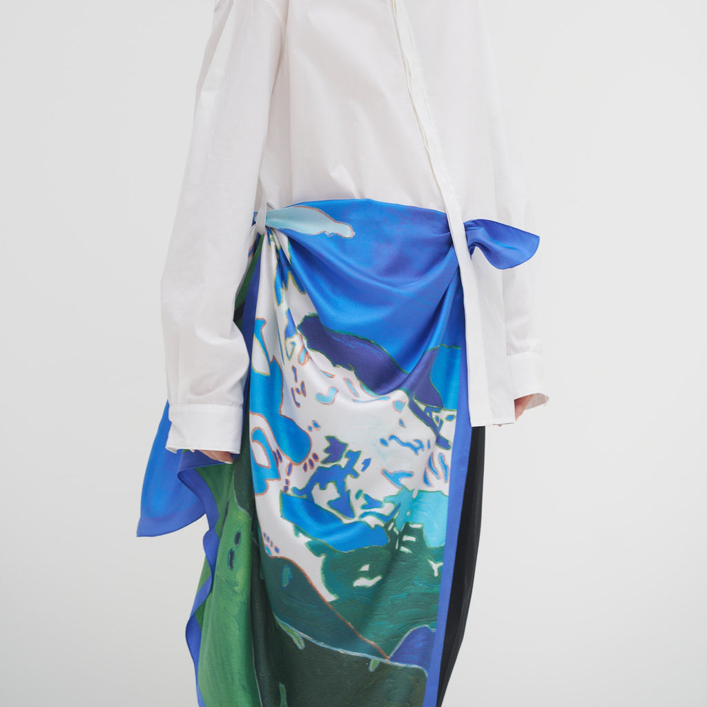 We have reviewed the manufacturing process and have created a scarf that is beautiful both on the front and back. In order to recreate the original energy of the work without losing it, we have stuck to using 100% silk material, and it has a firm, smooth texture that is also comfortable to wear around the neck.