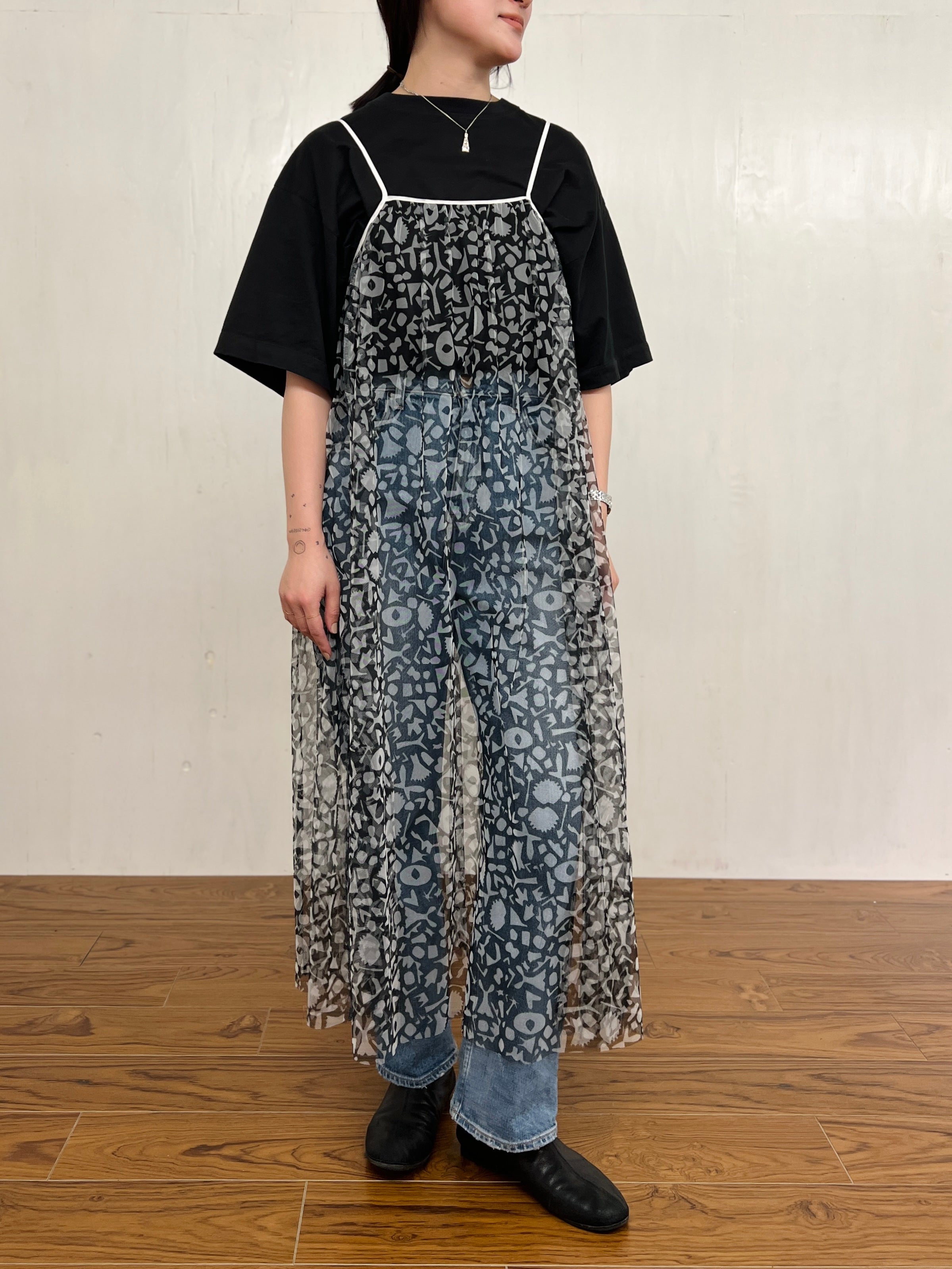 Trendy tulle material is transformed into a unique item with colorful art. This camisole dress is made of supple tulle and has colorful art visible through it. You can enjoy various styles depending on what you layer it with. The shimmering art is also a highlight of the gathers on the front and back, which are made with plenty of fabric.