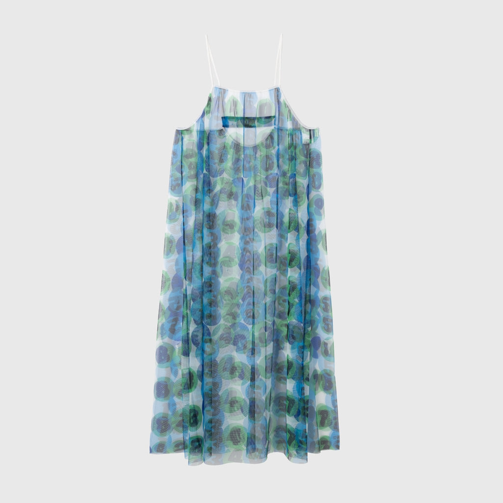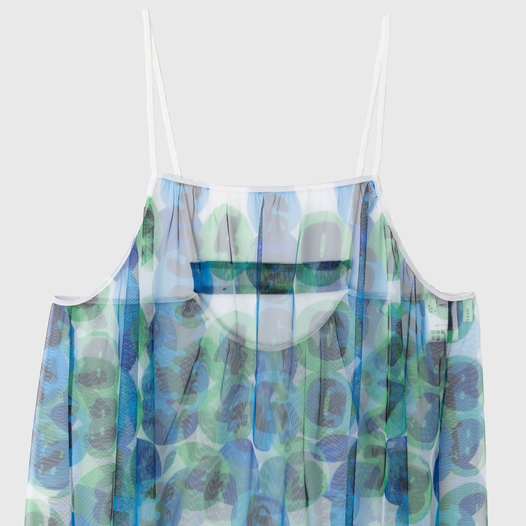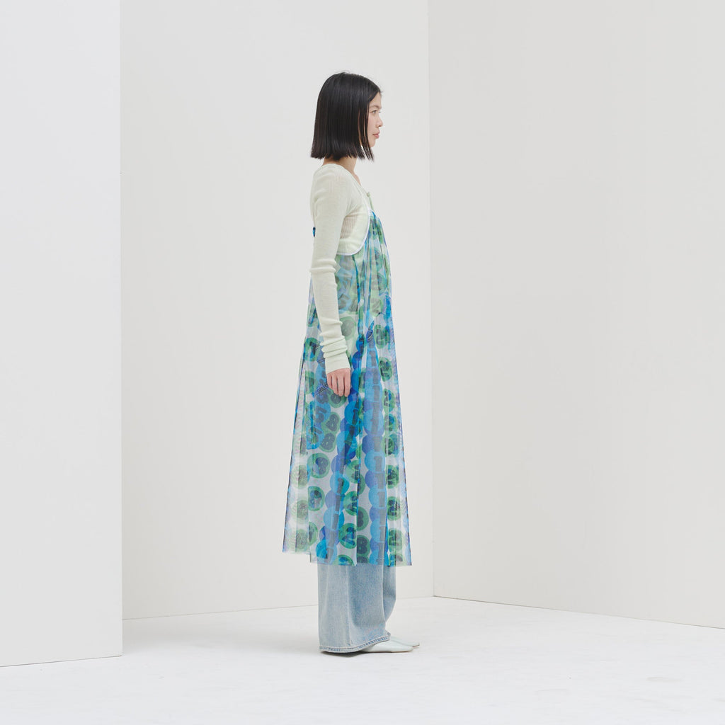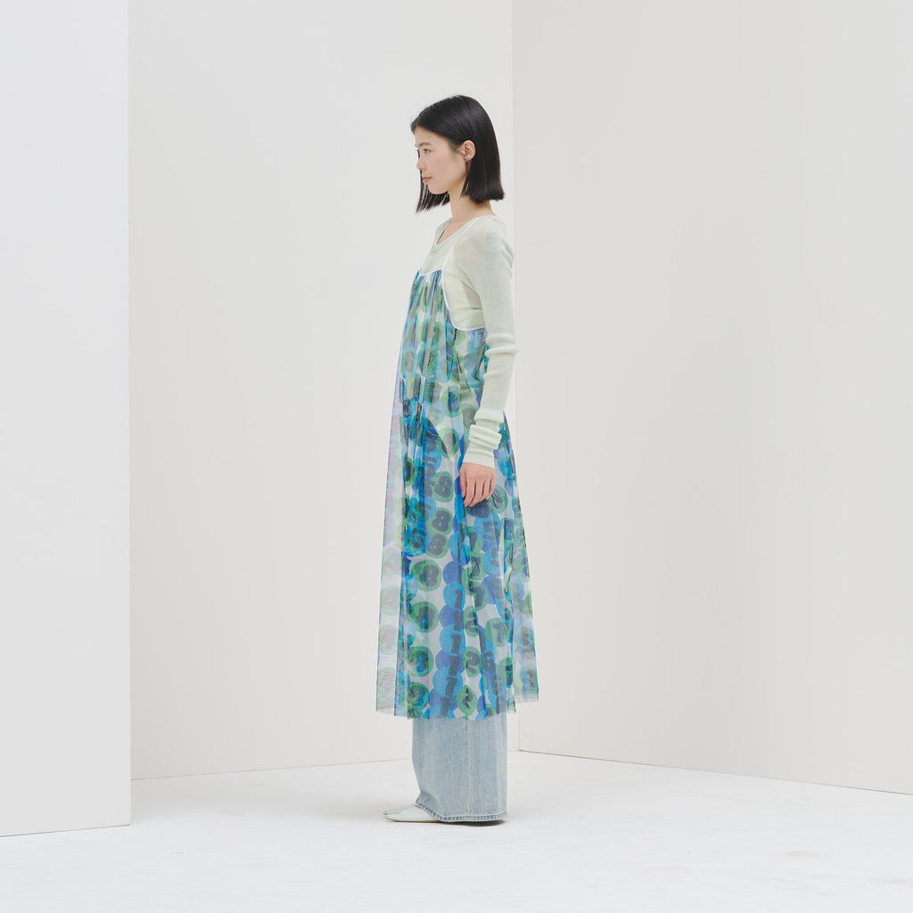 トレンドのチュール素材を、異彩のアートによって唯一無二の個性を持つアイテムに。しなやかなチュールを使用した、異彩のアートが透けるキャミソールワンピースです。レイヤードするアイテムによって様々な着こなしが楽しめます。生地をたっぷりと使用した前後のギャザーによって、ゆらめくアートもポイントです。