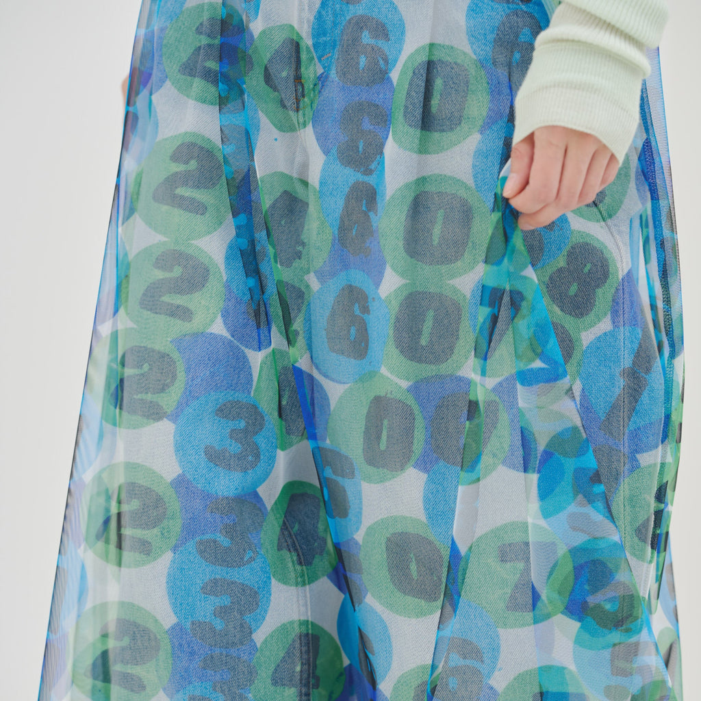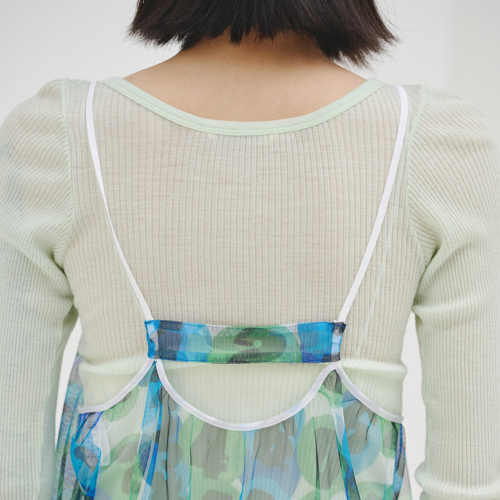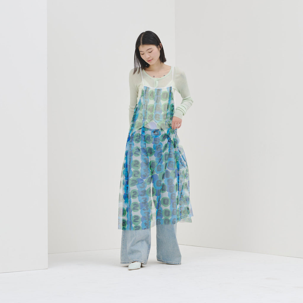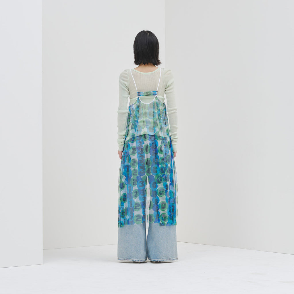 トレンドのチュール素材を、異彩のアートによって唯一無二の個性を持つアイテムに。しなやかなチュールを使用した、異彩のアートが透けるキャミソールワンピースです。レイヤードするアイテムによって様々な着こなしが楽しめます。生地をたっぷりと使用した前後のギャザーによって、ゆらめくアートもポイントです。