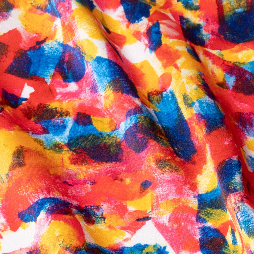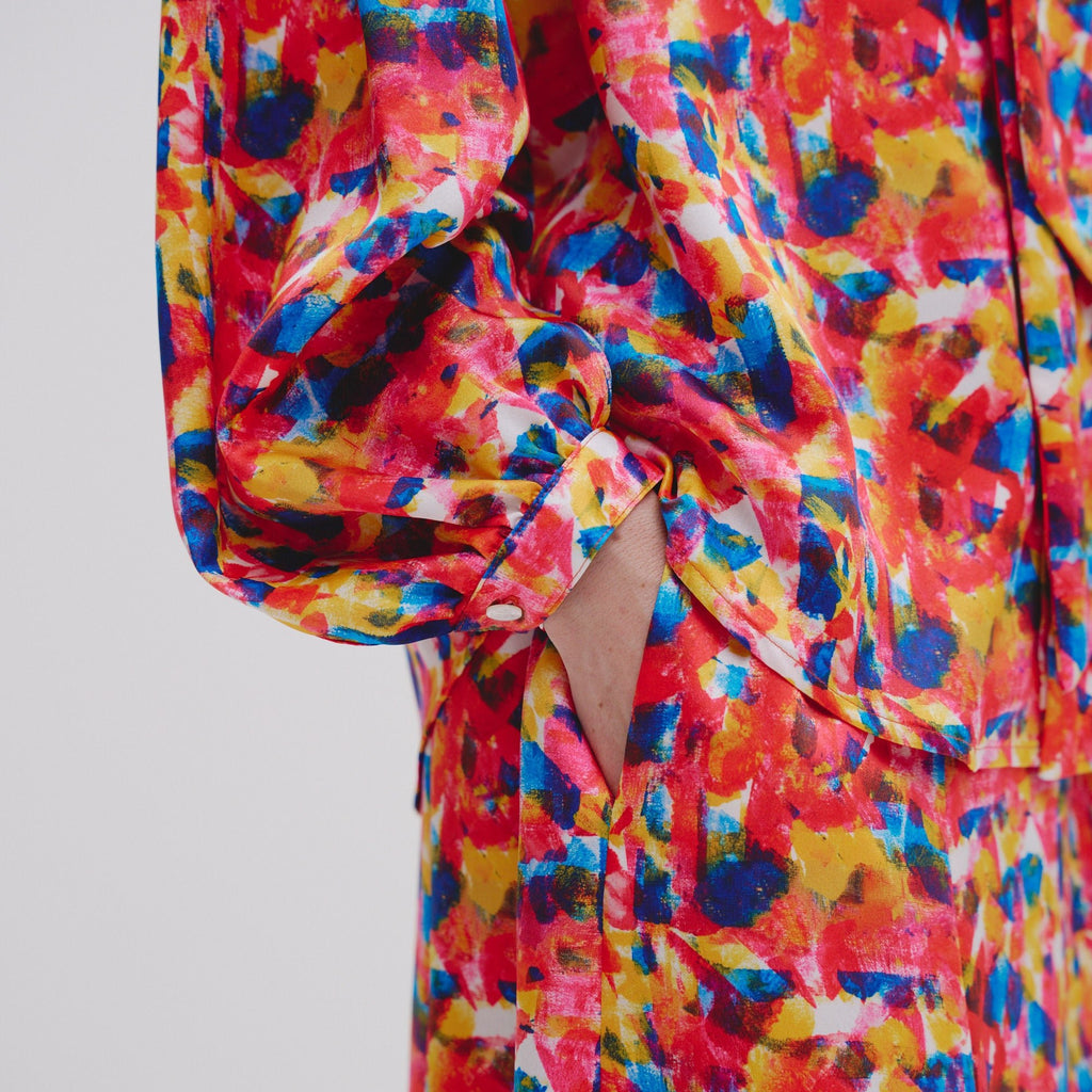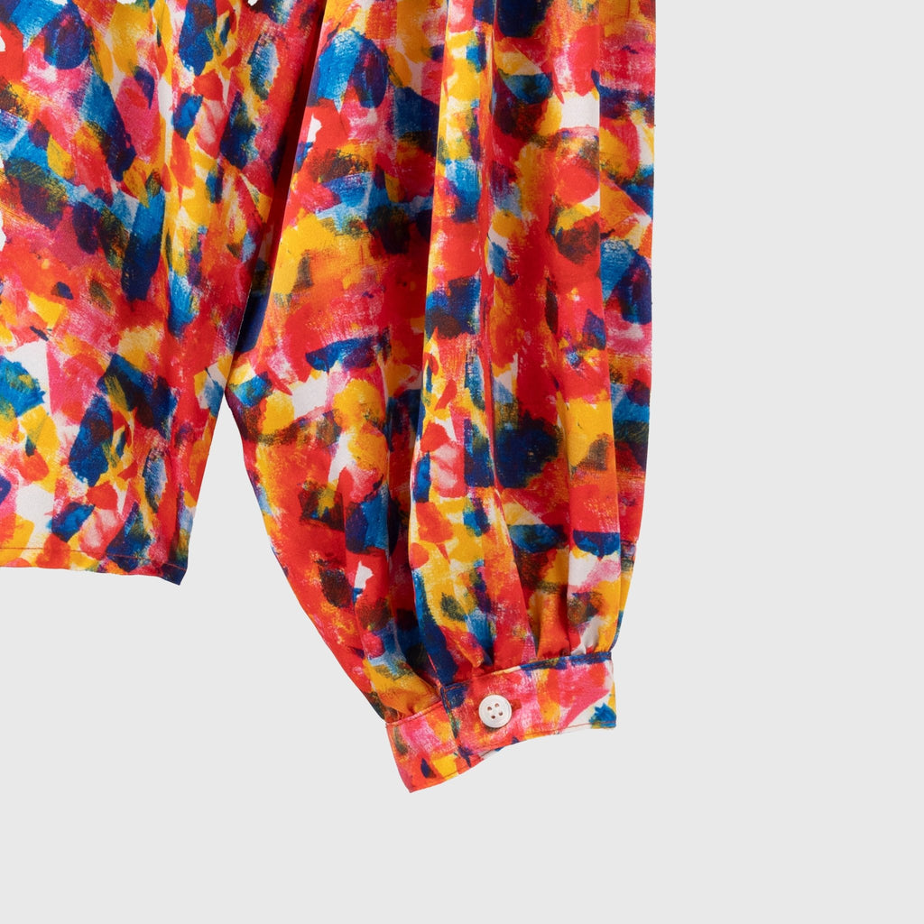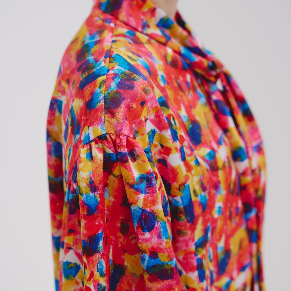 ■ L'élégance du crêpe satiné <br>Un motif est imprimé sur du crêpe satiné au léger brillant, créant ainsi un chemisier à imprimé intégral, idéal pour le bureau ou les grandes occasions. La matière présente une texture ferme et légèrement épaisse.
