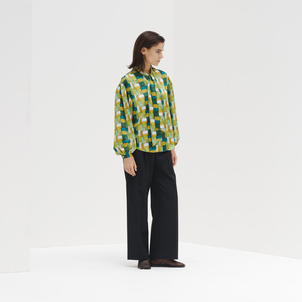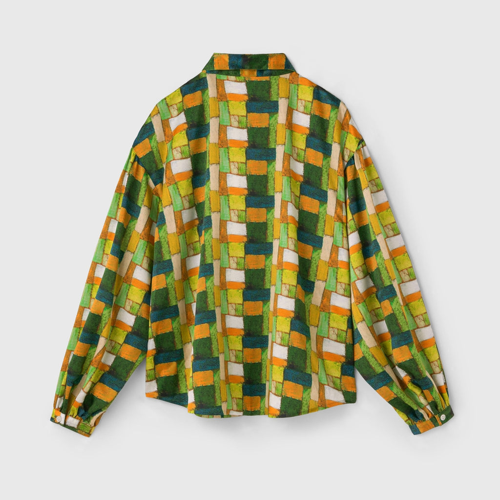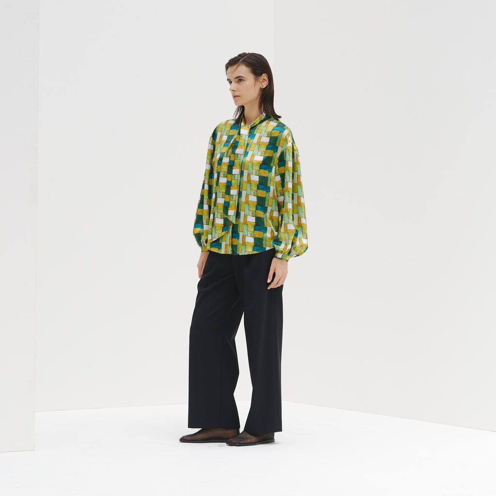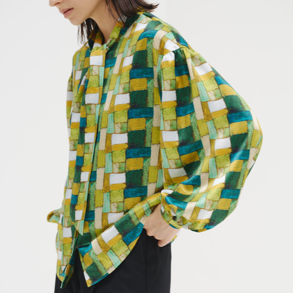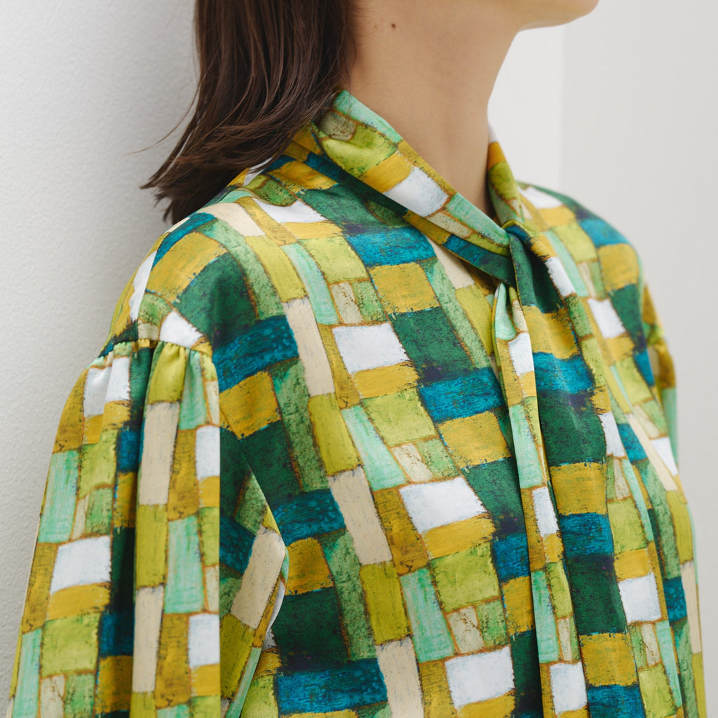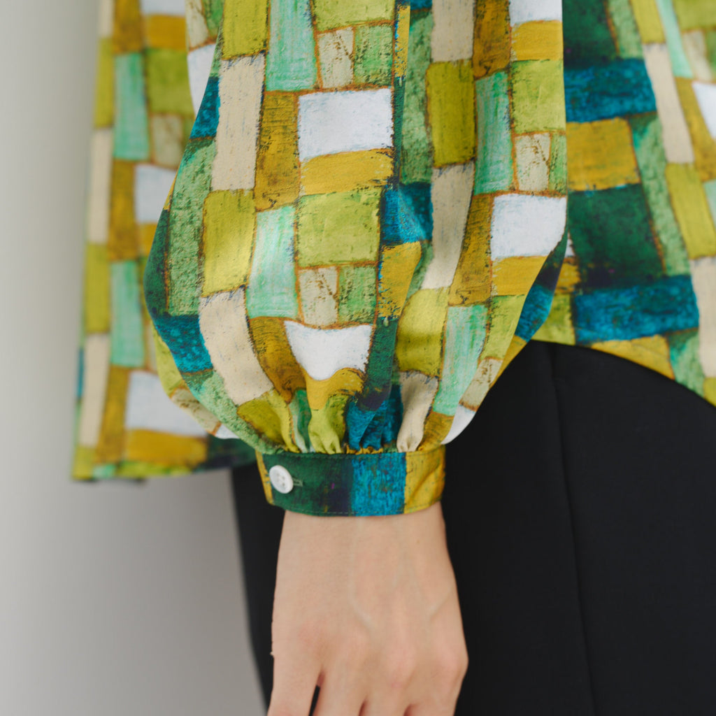 ほのかな光沢を感じるクレープサテンにアートをプリントし、オフィスやオケージョンでも着用できる総柄ブラウスに仕上げました。ハリ感のあるやや肉厚な素材感です。