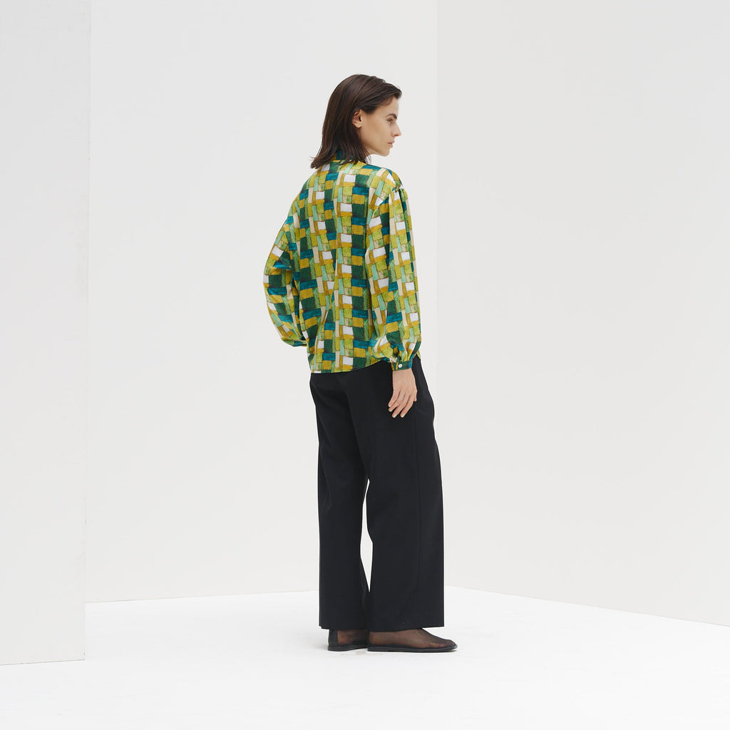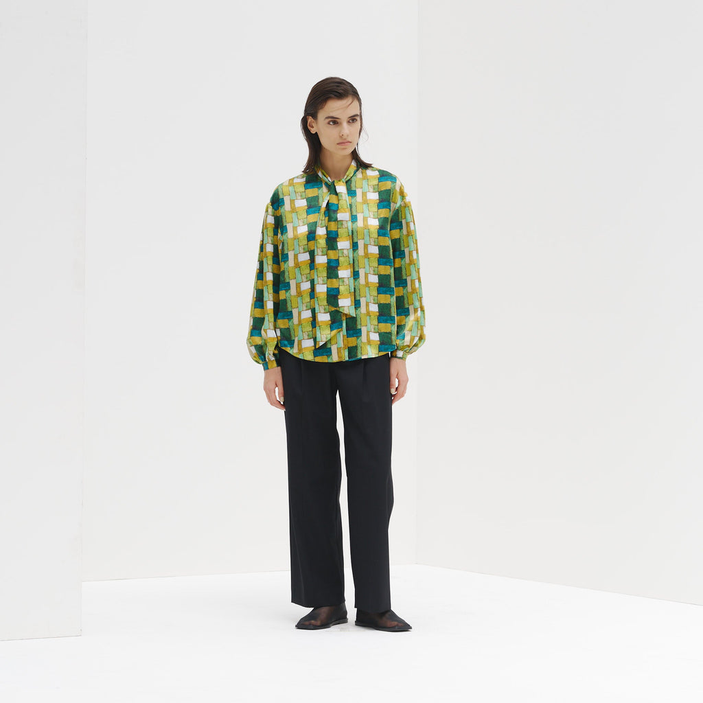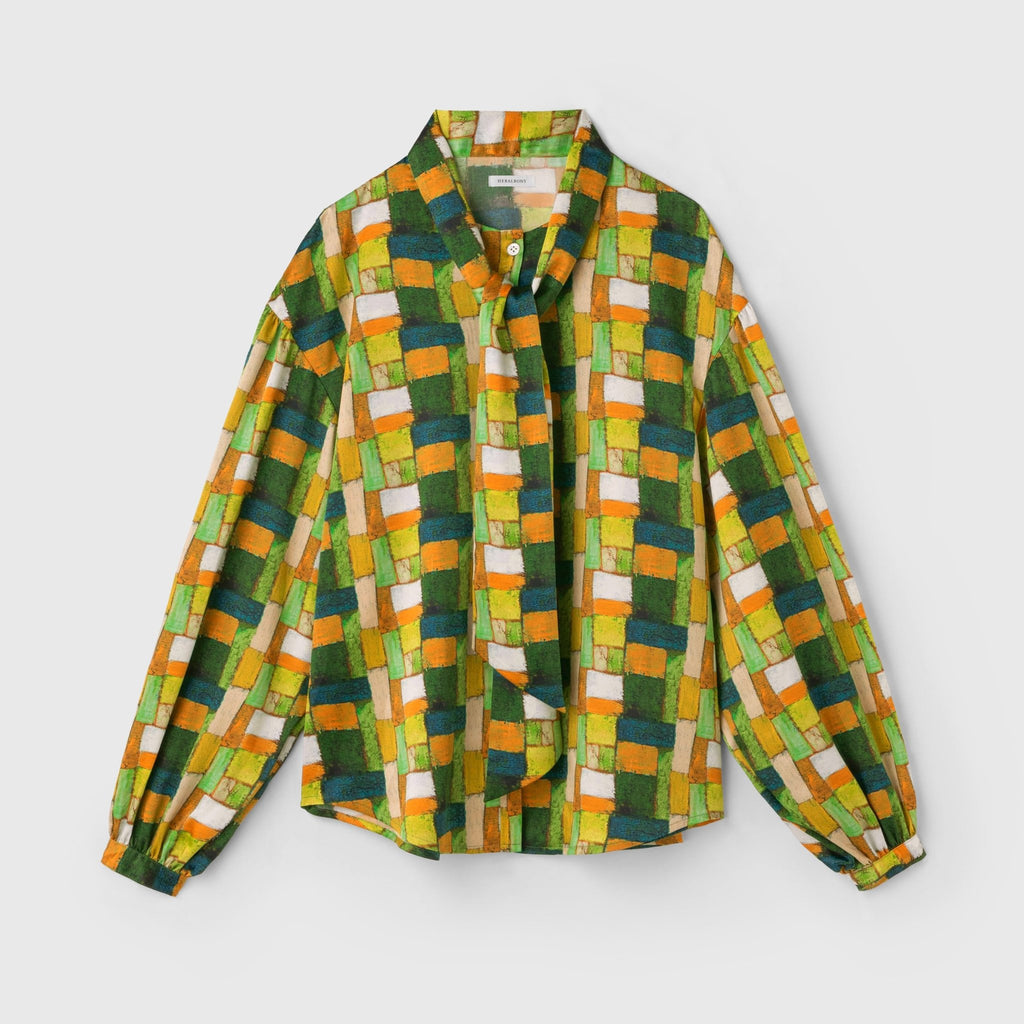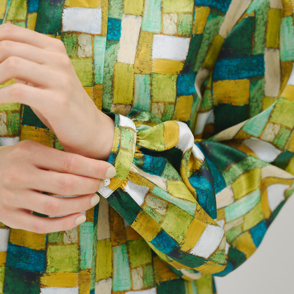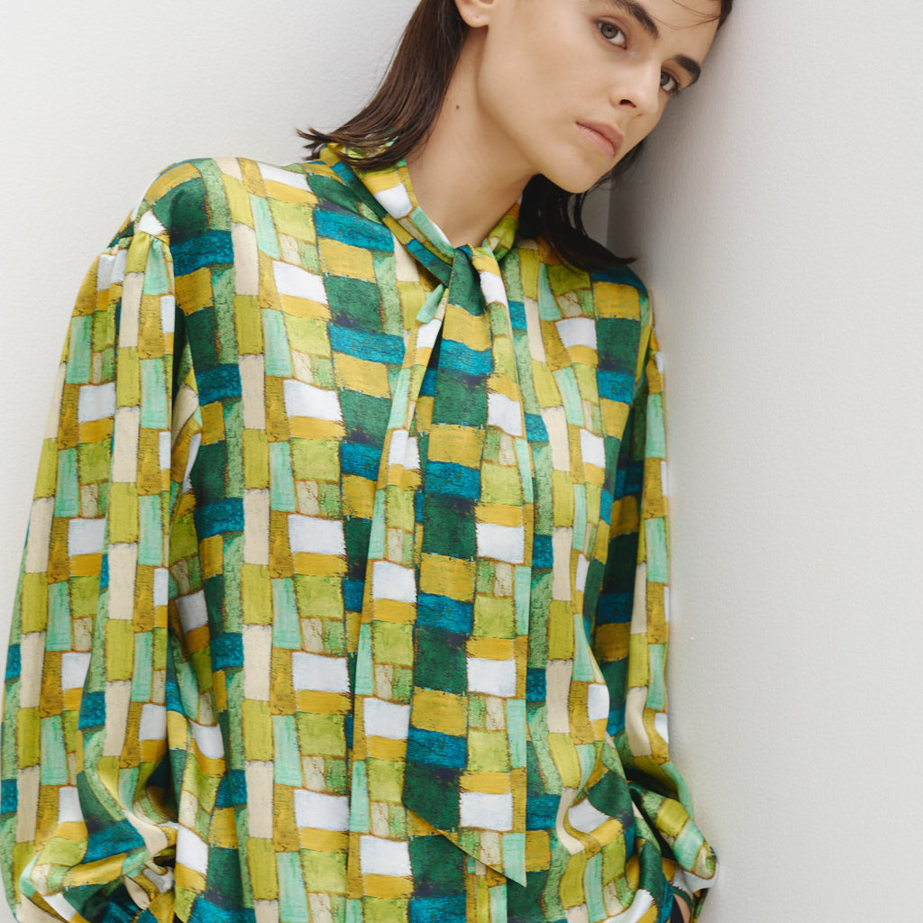 ほのかな光沢を感じるクレープサテンにアートをプリントし、オフィスやオケージョンでも着用できる総柄ブラウスに仕上げました。ハリ感のあるやや肉厚な素材感です。