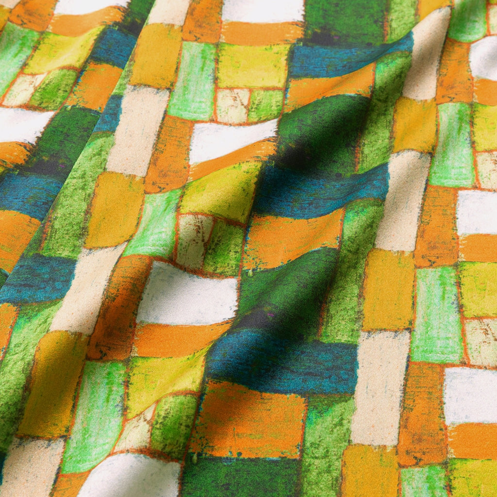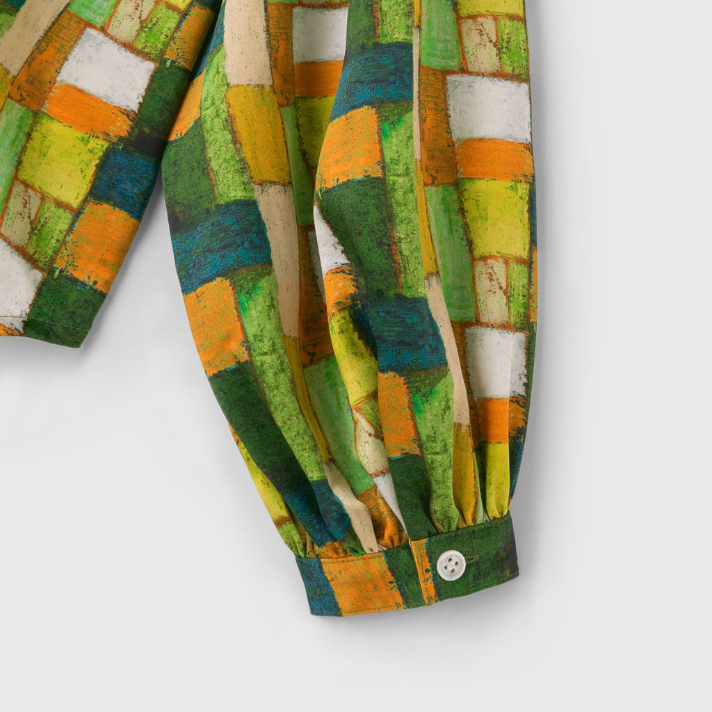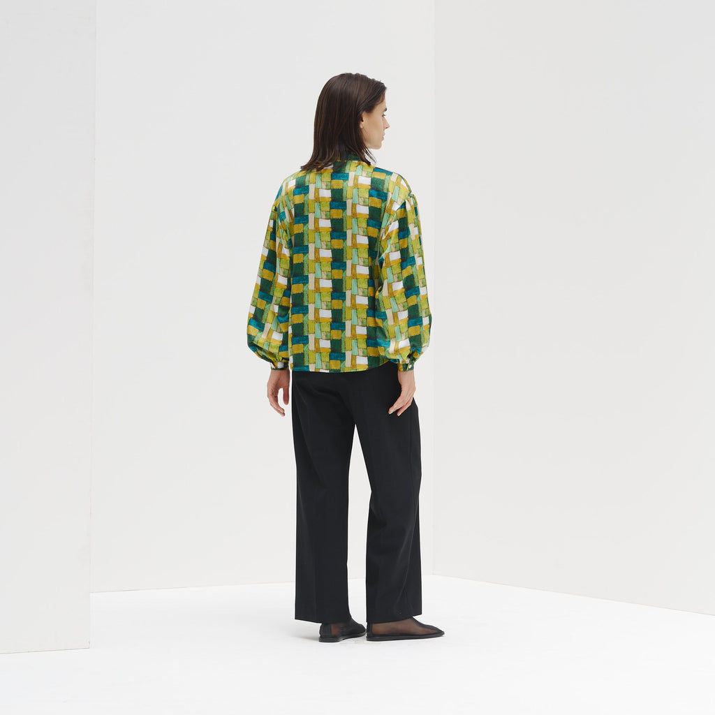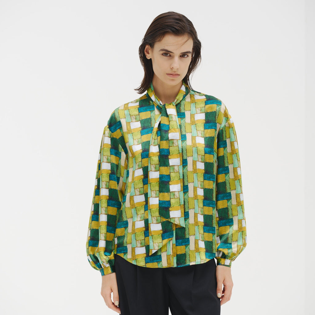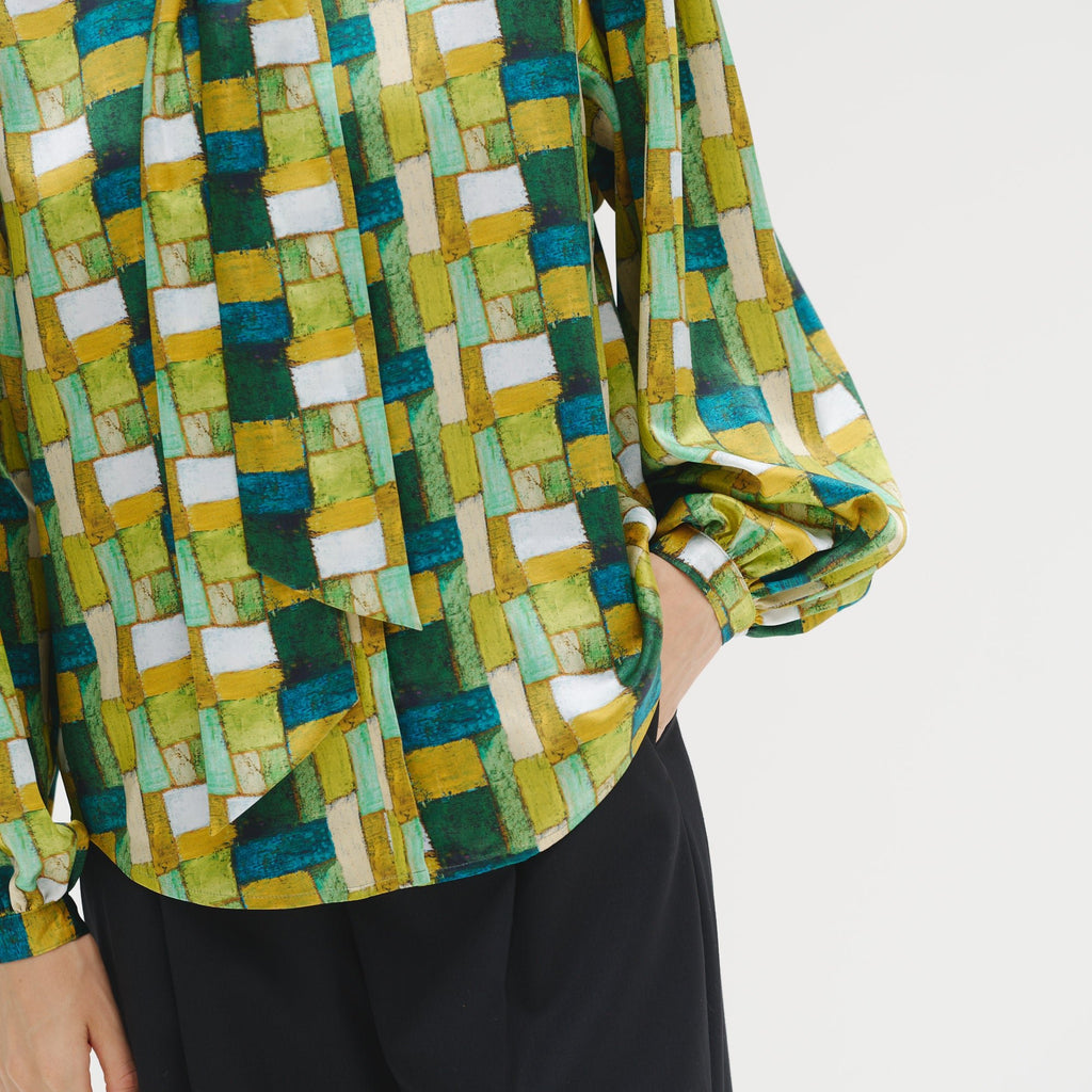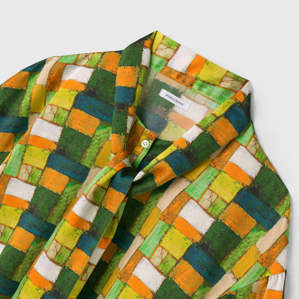 ほのかな光沢を感じるクレープサテンにアートをプリントし、オフィスやオケージョンでも着用できる総柄ブラウスに仕上げました。ハリ感のあるやや肉厚な素材感です。
