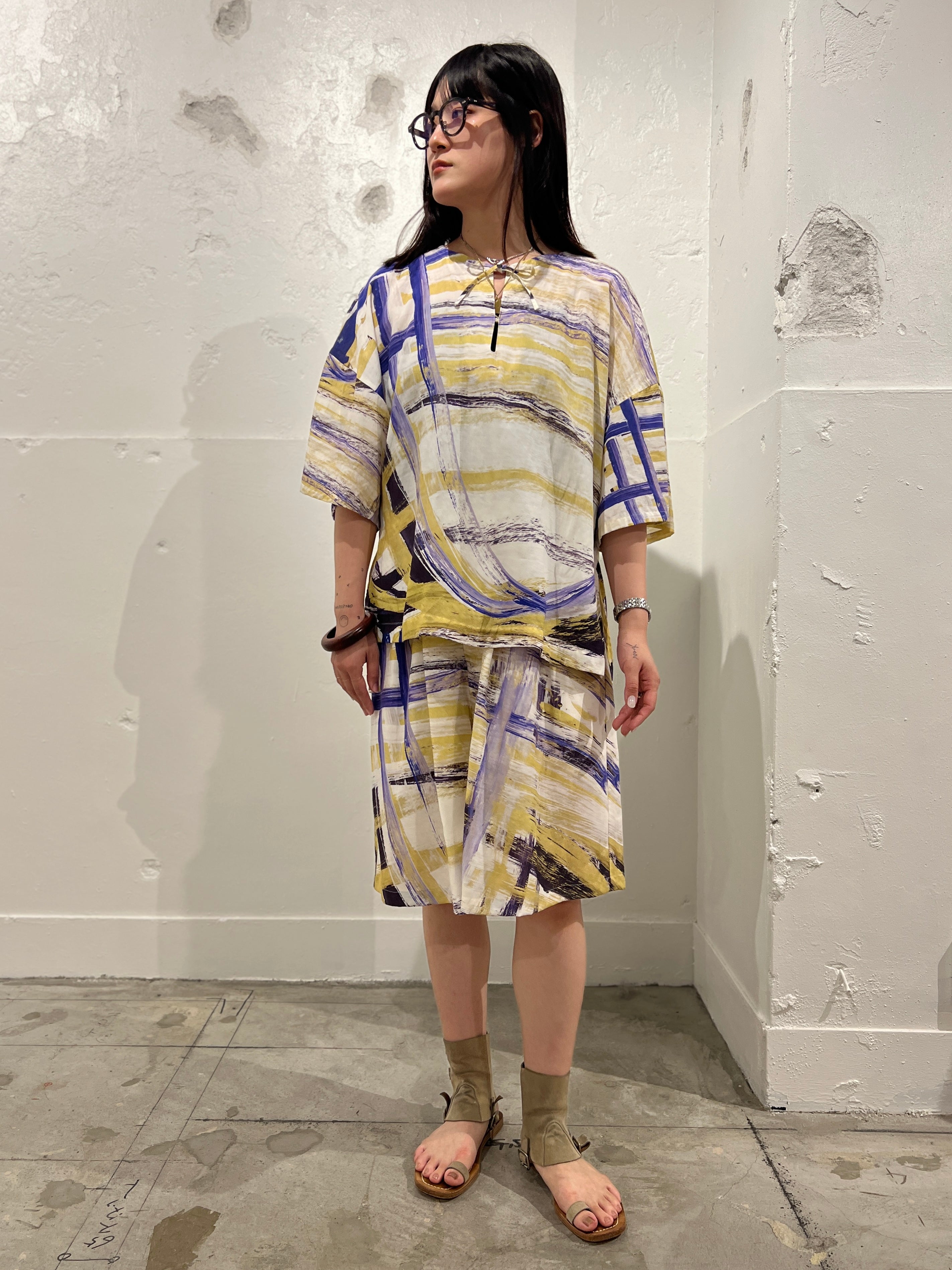 L'œuvre utilisée est une œuvre de Momoko Nakagawa, dont les coups de pinceau puissants la distinguent. L'imprimé audacieux met en valeur le dynamisme de la pièce. Grâce à une disposition volontairement asymétrique des pièces, la pièce peut être harmonieusement portée, même en ensemble.