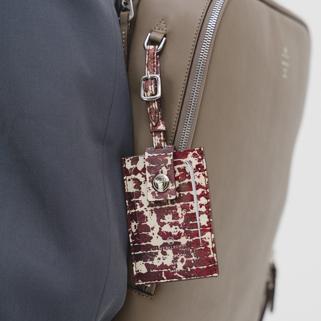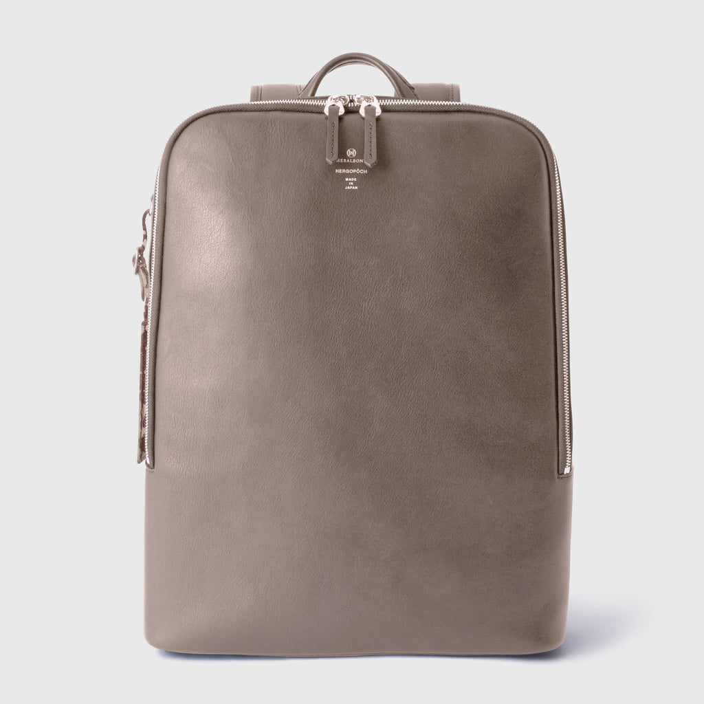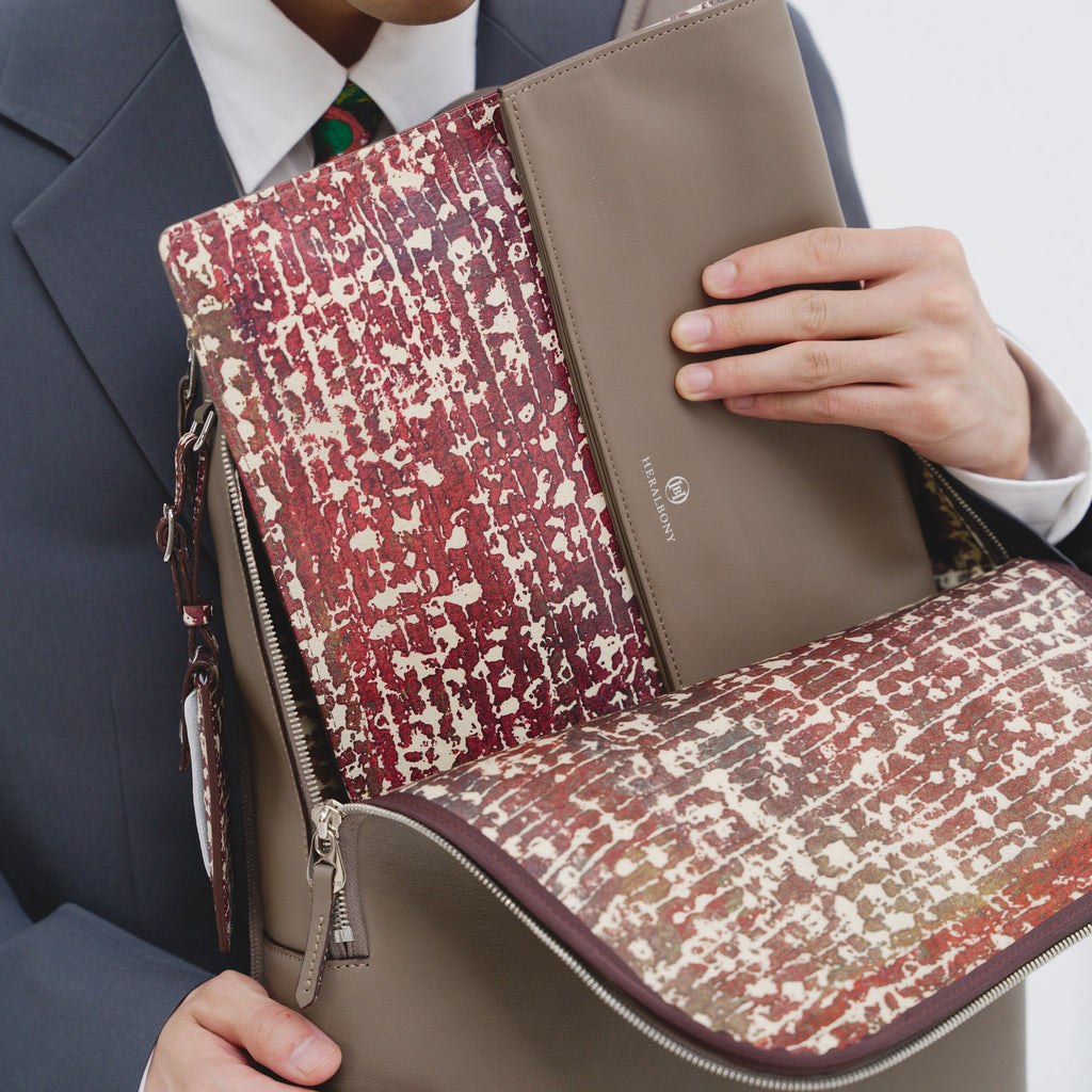 高級感あふれるレザーを使った、裏地でアートを楽しむバックパック。牛革の質感が活きるミニマルなデザインは、オンオフ問わずスタイリングを格上げします。アートをまとったパスケースは取り外し可能です。通気性が良いメッシュ素材の背面には、13インチ対応のPC用ルームも用意。スーツケースに取り付けられるキャリーループをつけ、ビジネスユースにも最適です。素材の開発からメイドインジャパンにこだわり、国内でも有数の熟練した職人の手によって仕立てられるレザーブランド「HERGOPOCH」とのダブルネームモデルです。