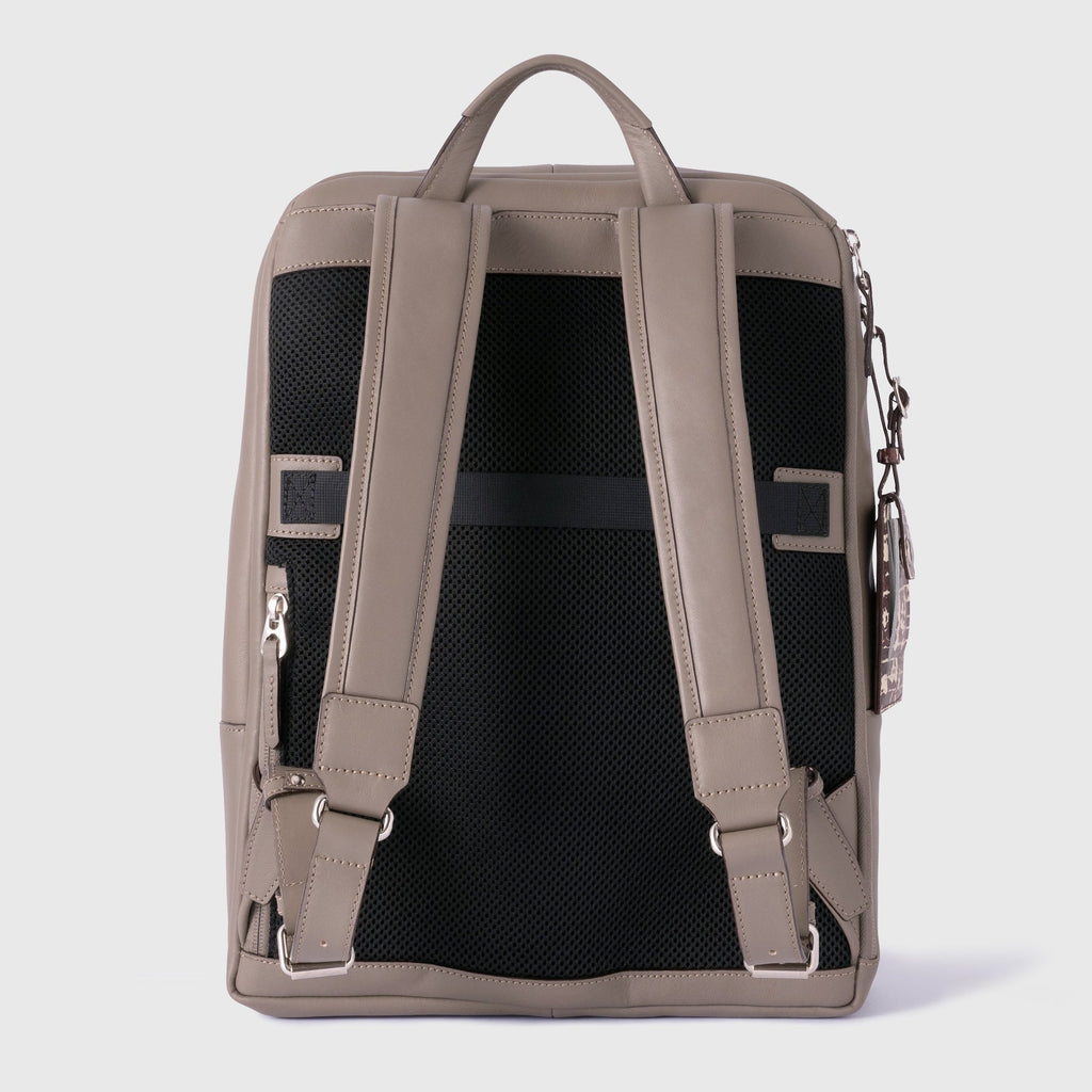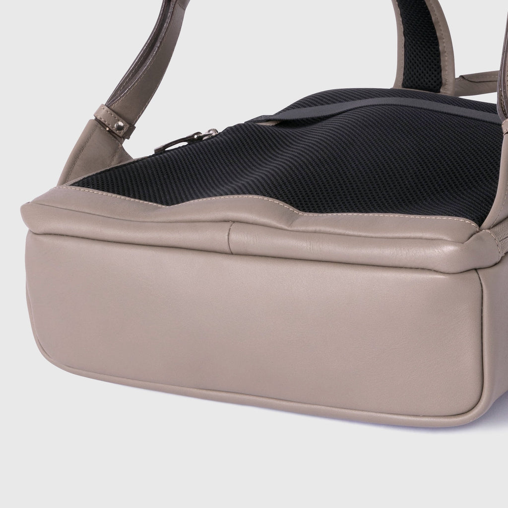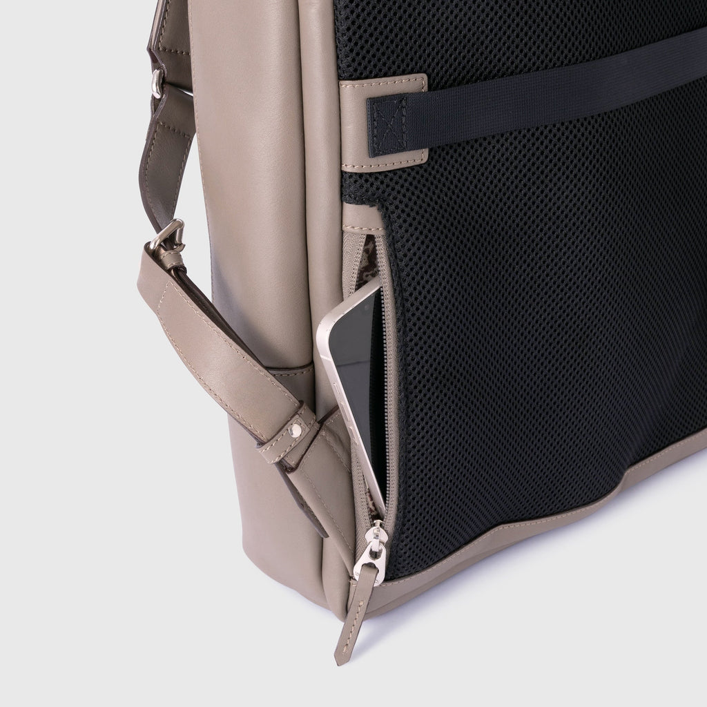 大きく開く開閉部は物の出し入れが簡単。内部にはファスナーポケットと2つのオープンポケット、ペン差しをつけ貴重品やすぐに取り出したいアイテムを入れられます。背負っているときも快適なメッシュの背面には、PC用ポケットとファスナーポケットをつけ、スマートに取り出すことができます。