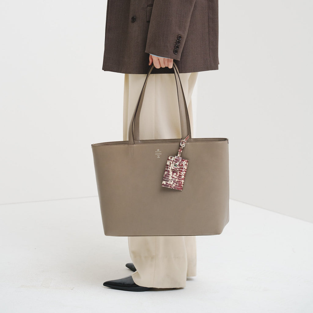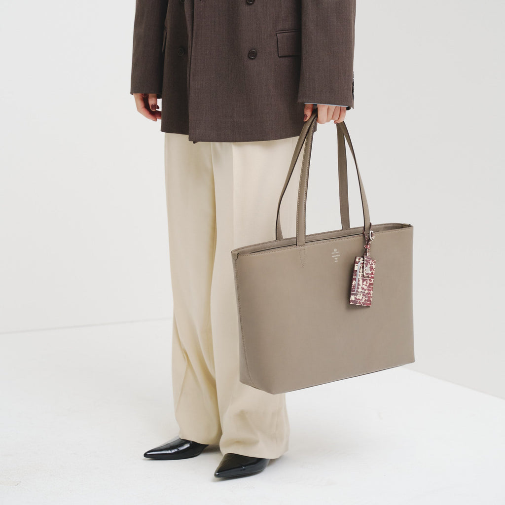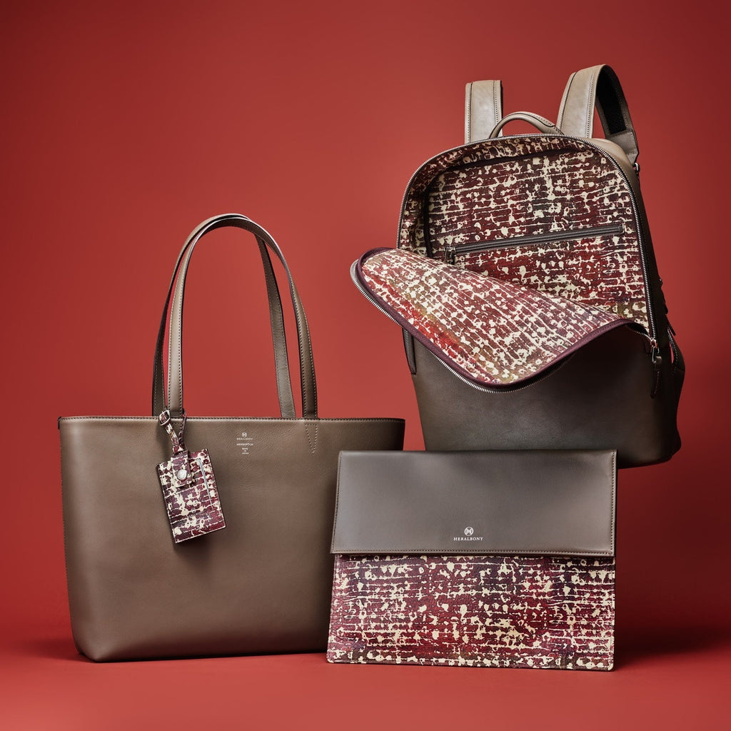 ロゴだけをあしらったミニマルなレザートートは、裏地にアートを起用することでオンオフ問わず馴染むスタイルに。開くたびにエネルギーあふれる異彩のアートが広がります。PCや書類もしっかり入るワイドサイズで、出張や休日の旅行にも対応する収納力もポイントです。